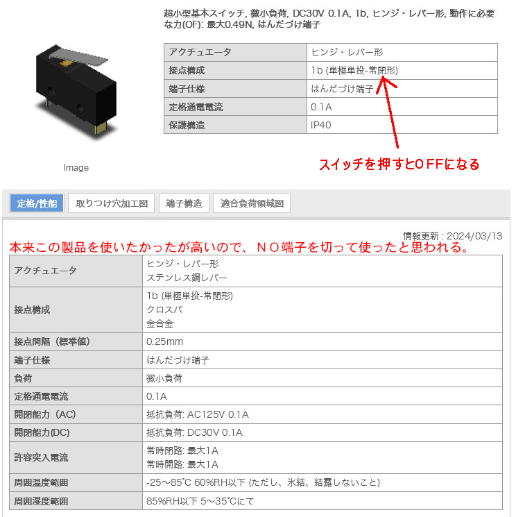 マイクロスイッチ 常時ON スイッチ押しでOFFに SS-01GL-2加工