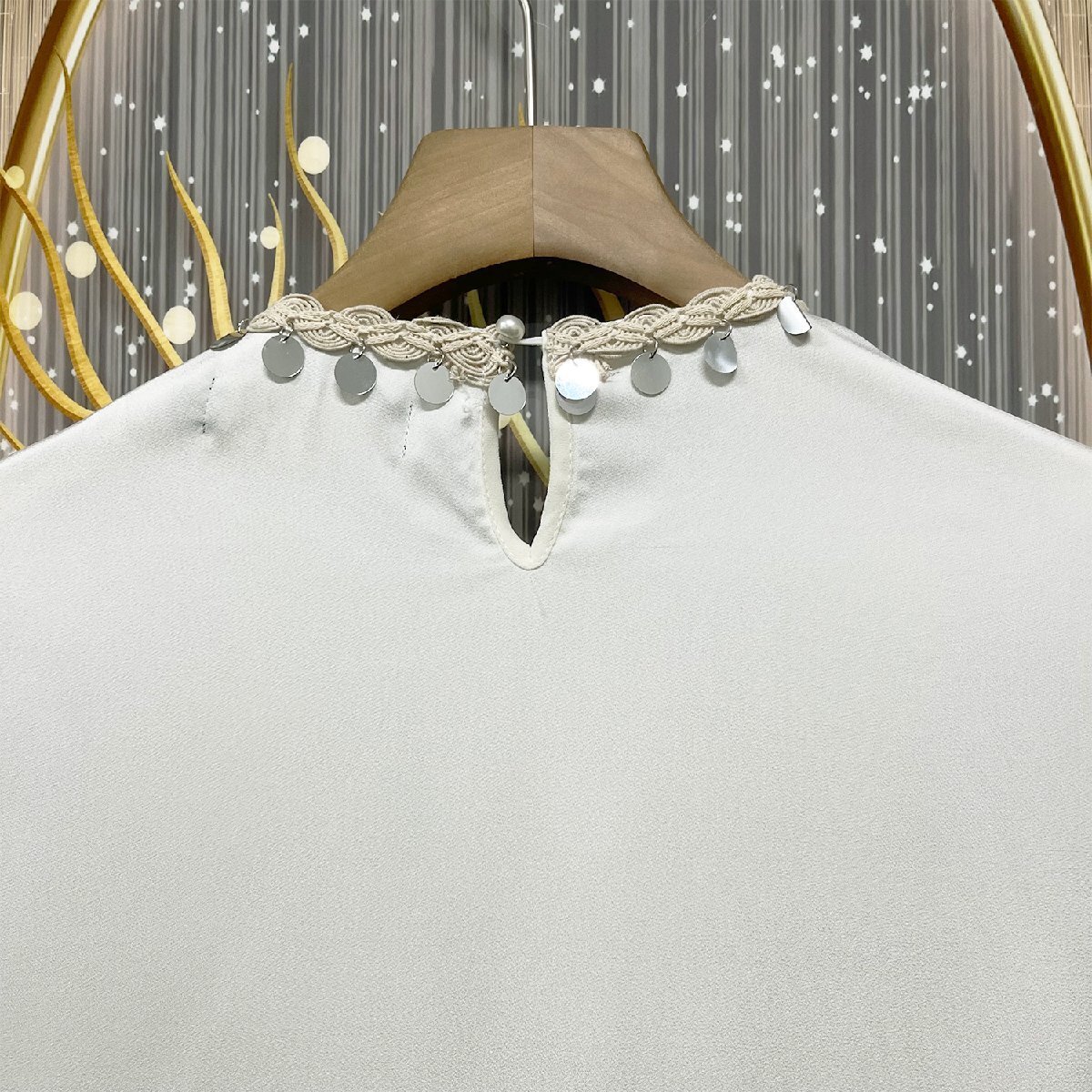 裾にあしらわれた透かしレースがフェミニンな印象を与え、ネック部分のスパンコール装飾がキラキラと煌めいて目を引き、スタイリングを華やかに彩ります。