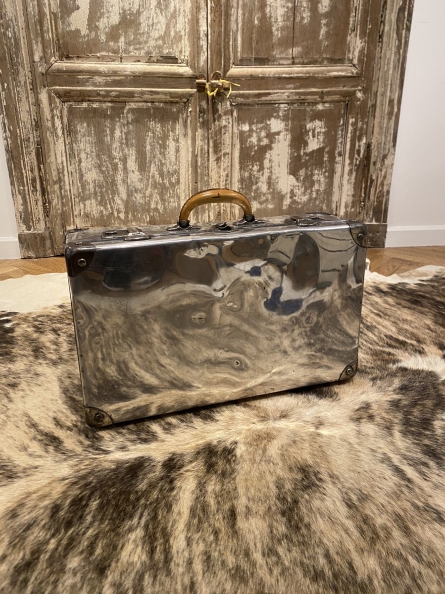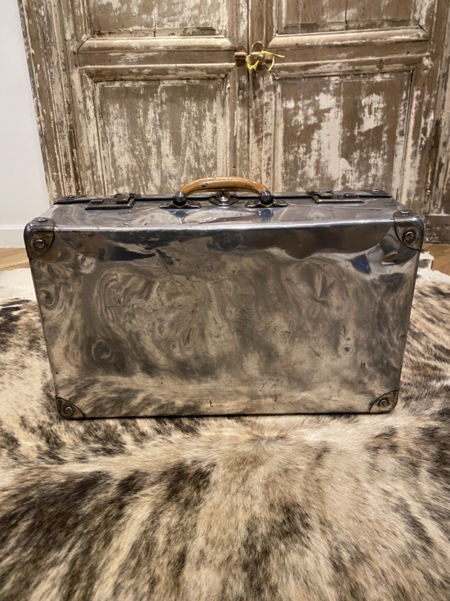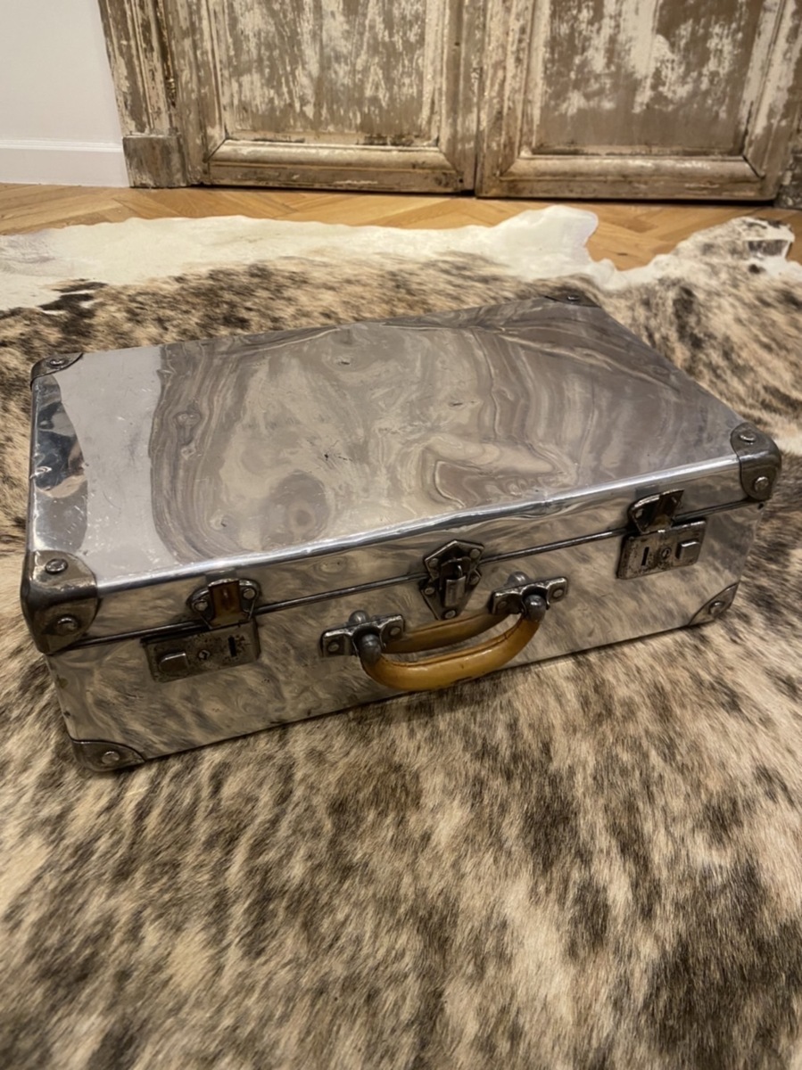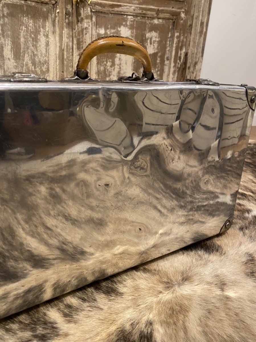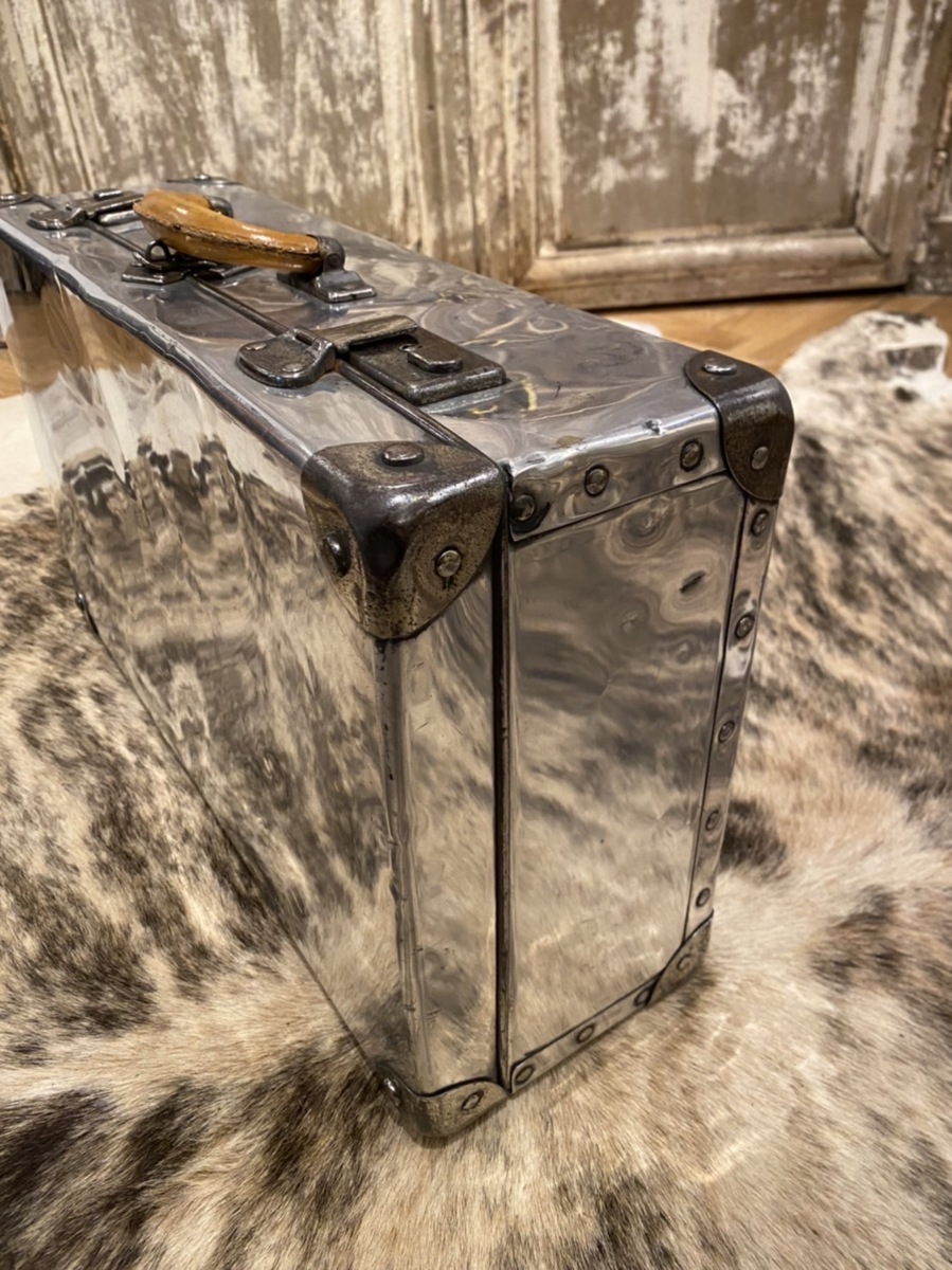 本体はアルミ製、内貼りは麻素材の生地、レザーベルト、鍵は真鍮製、鍵の付属なし。