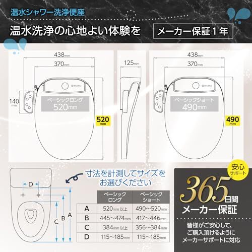 【2種類の大きさをご用意】ベーシックロングタイプとベーシックショートタイプの2種類をご用意しております(寸法はカタログ参照)。お持ちの便器の大きさを測定して規格の合うものをご購入ください。