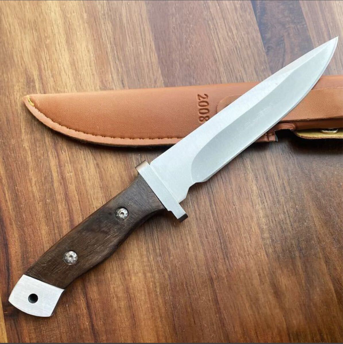 シンプルながらも力強いデザインで、ブレードの厚みと木製ハンドルが特徴的です。