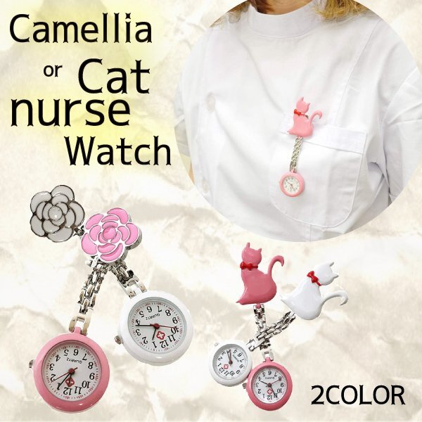 送料無料 ナースウォッチ カメリア キャット クリップ式 / 選べる2色,2タイプ 時計 夜勤 安全ピン 可愛い 薔薇 椿 猫 neko 逆さ時計 夜間
