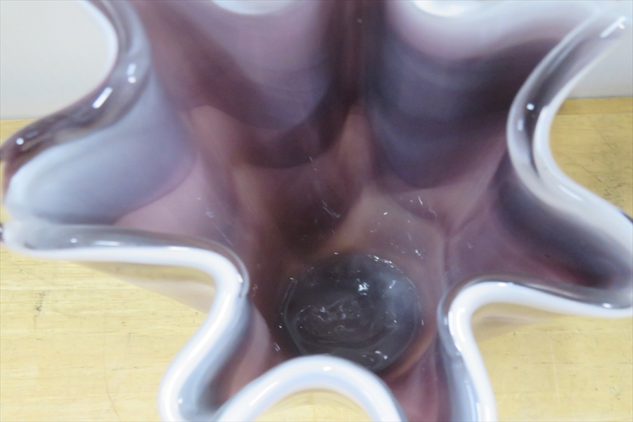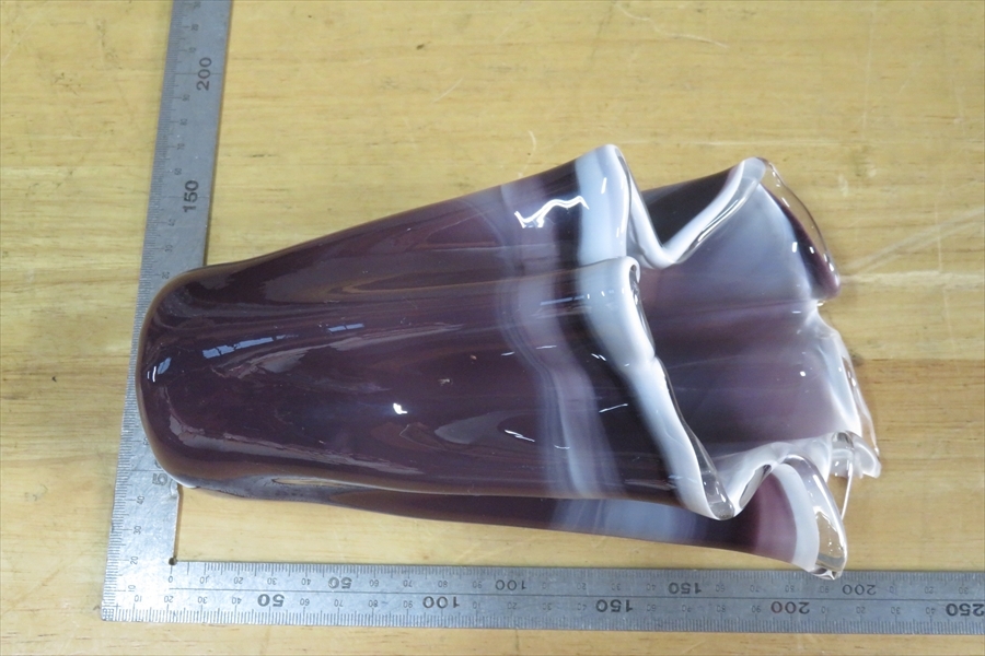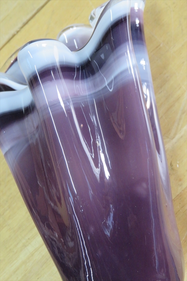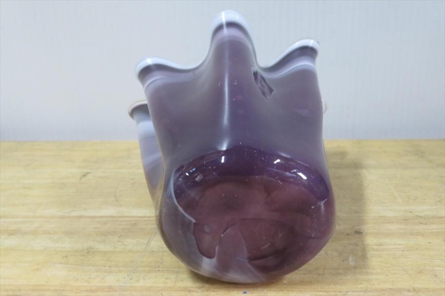 ●●パープル フリルガラス フラワーベース 紫マーブル ミルクガラス 花入れ 花瓶 花器 ガラス工芸●●