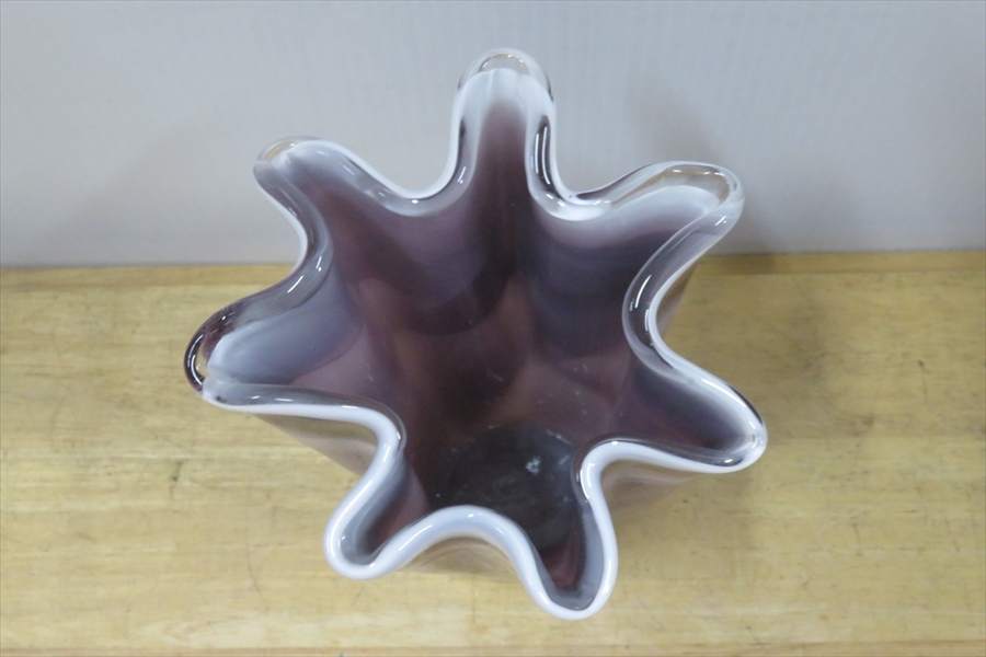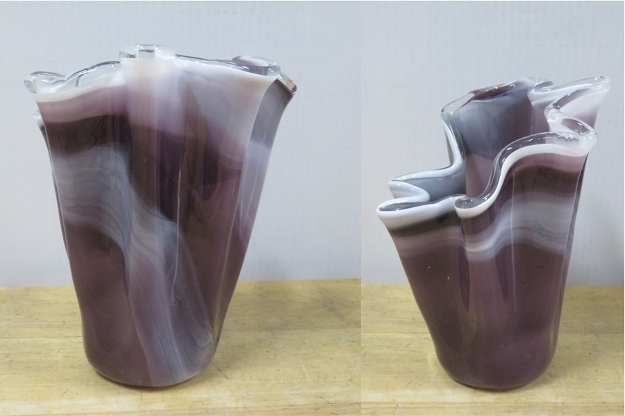 ●パープル フリルガラス フラワーベース 紫マーブル ミルクガラス 花入れ 花瓶 花器 ガラス工芸●