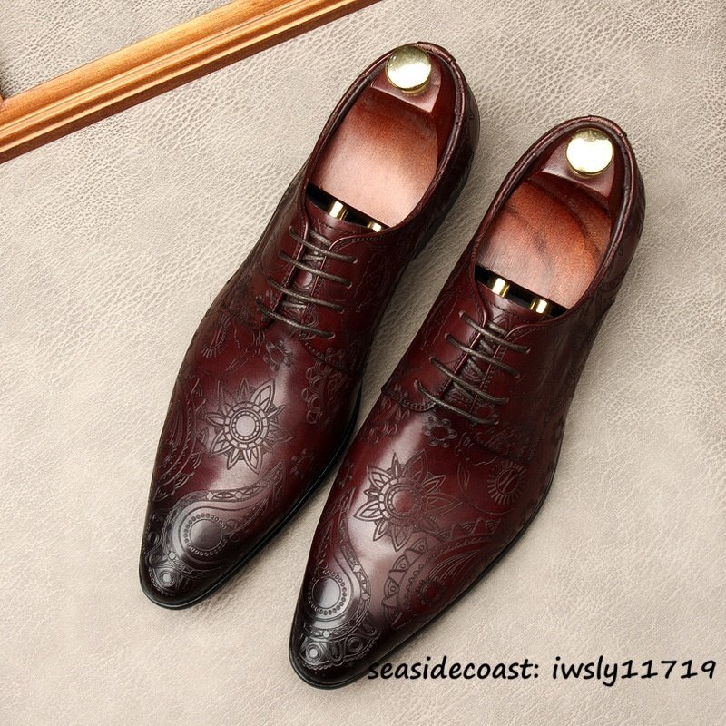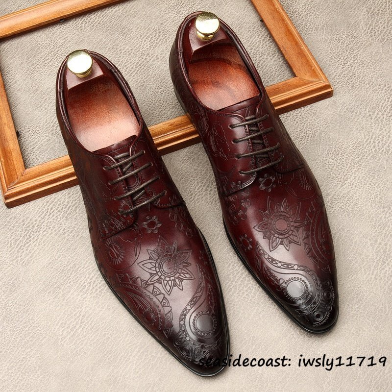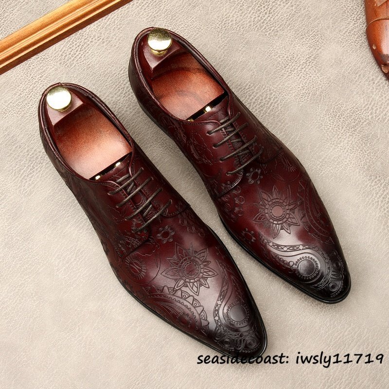 定価11万超★最高級 ビジネスシューズ 本革 レザーシューズ 超希少 職人手作り 総柄 牛革 紳士靴 メンズ フォーマル 革靴 レッド 27.5cm