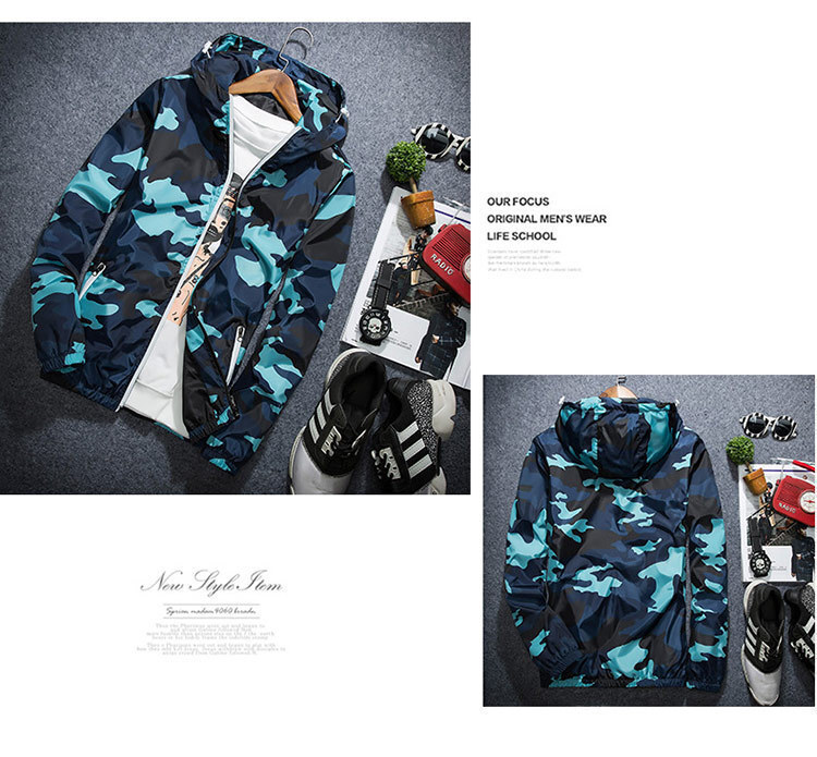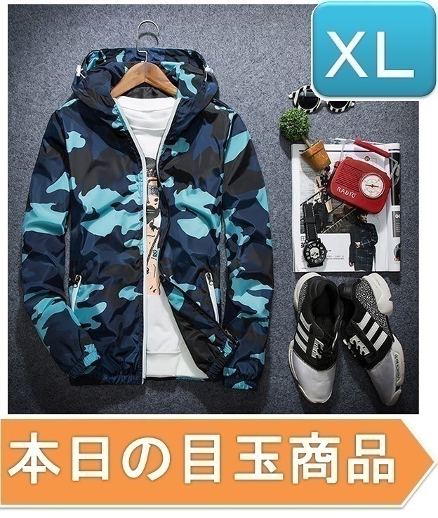 ☆1スタ 【175】 迷彩 ウィンドブレーカー フード付き ブルー XL メンズ ナイロン カモフラ 柄 アウトドア 防風 軽量 ジャケット