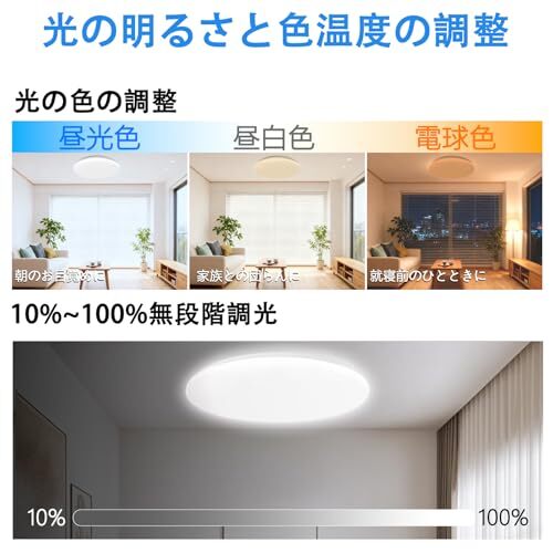 【LEDシーリングライト10畳】 調光12段階・調色7段階に対応した高性能シーリングライトで、リビング、キッチン、寝室、書斎など、あらゆる部屋・シーンに最適な明るさと色味をお選びいただけます。