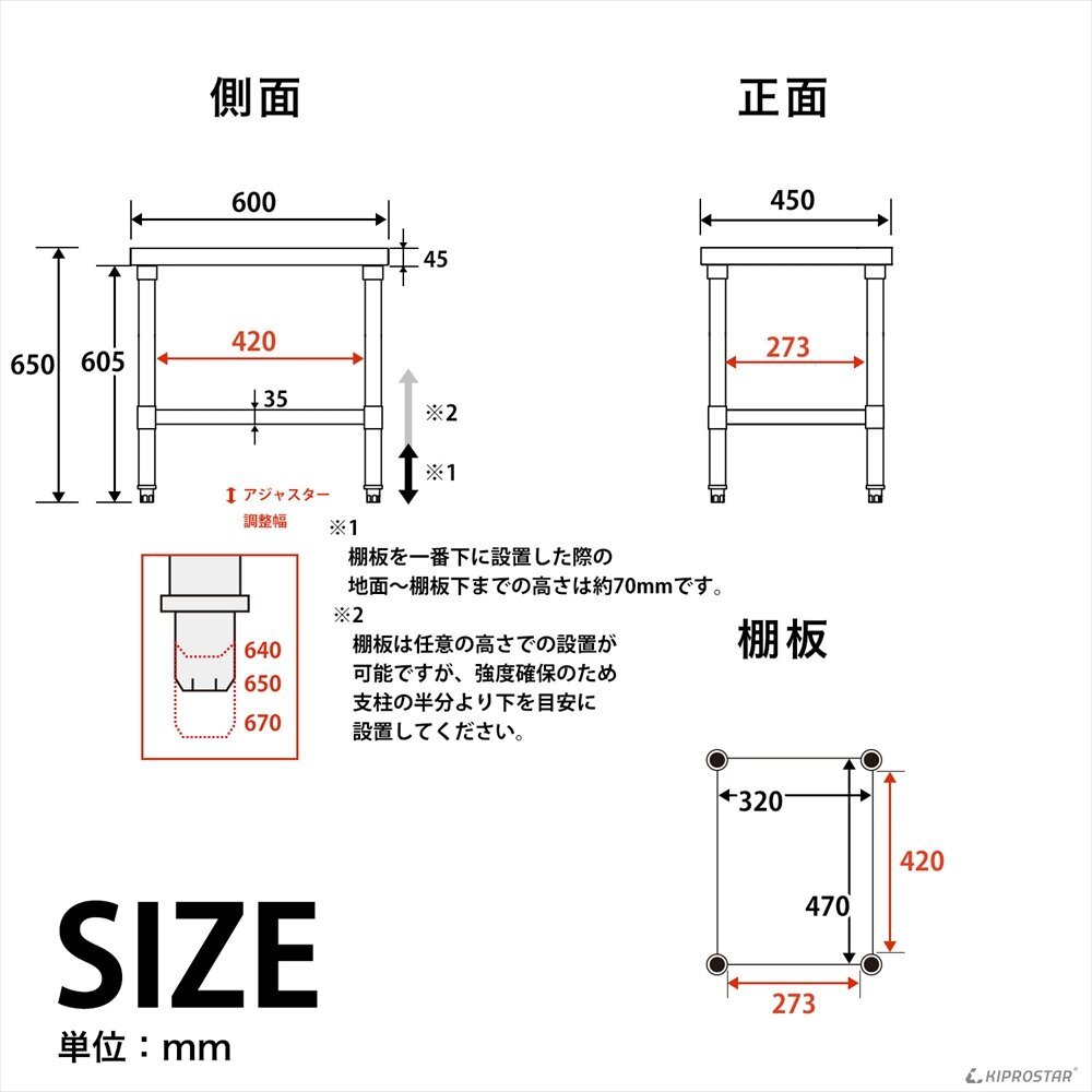 | 材質 | 天板:ステンレスSUS430 脚:ステンレスSUS201 梁:スチール アジャスト脚:ステンレスSUS201/PVC |