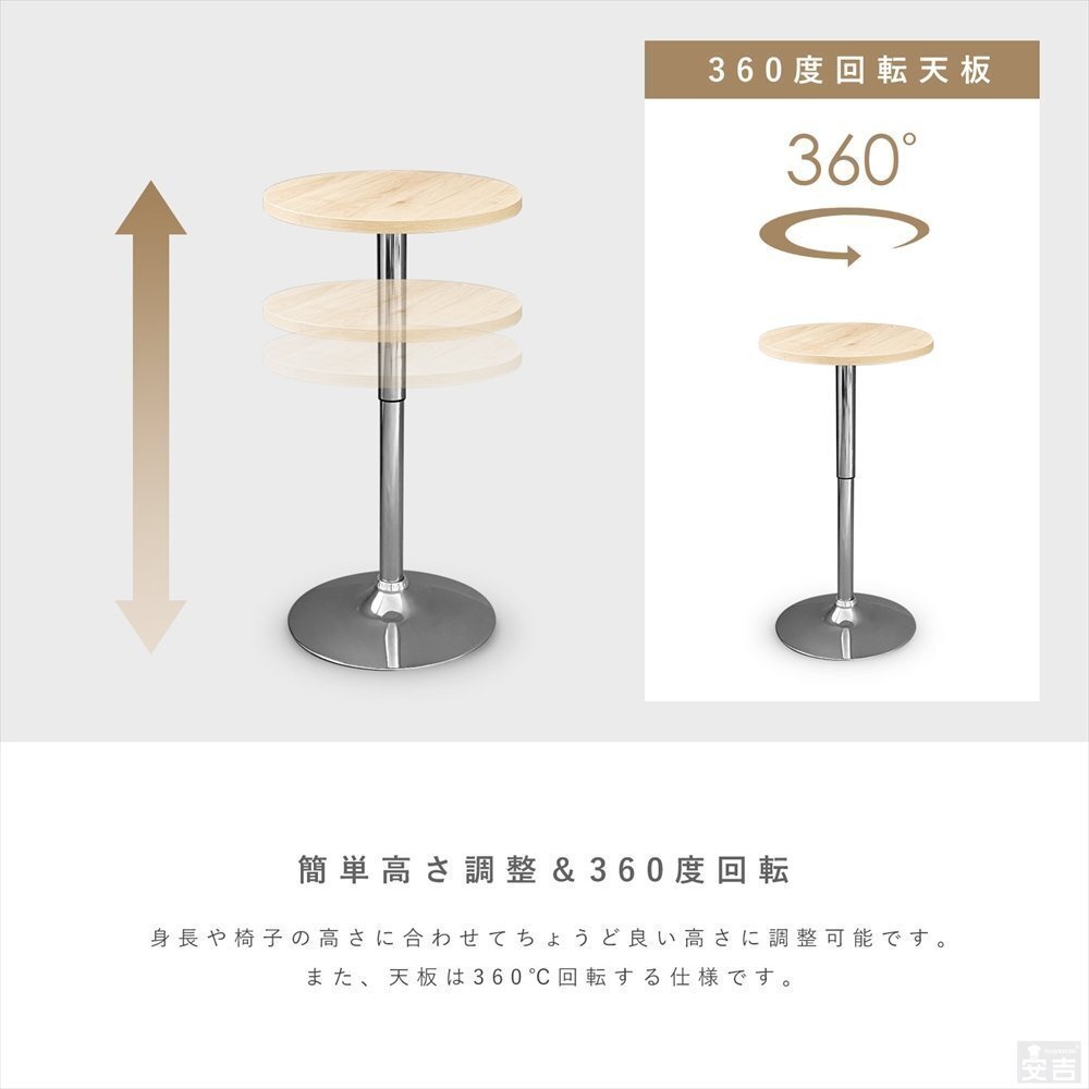 | 特長 | ・テーブルは360度回転します。 ・テーブル下のレバーで高さを調整できます。 ・バーやカフェのテーブル、休憩室や喫煙室のテーブルにも最適です。 ・昇降式なので座ってでも立ってでも利用できるテーブルです。 |