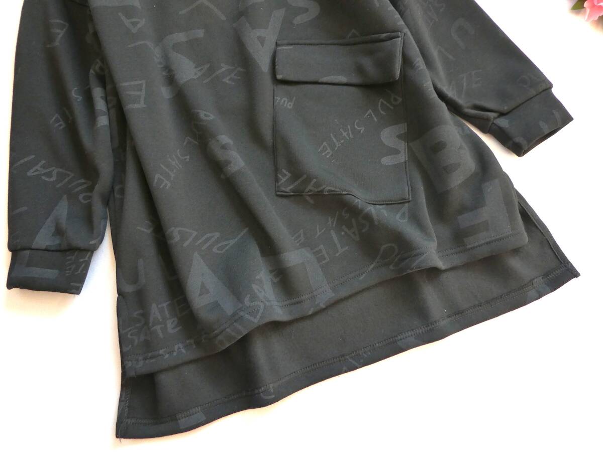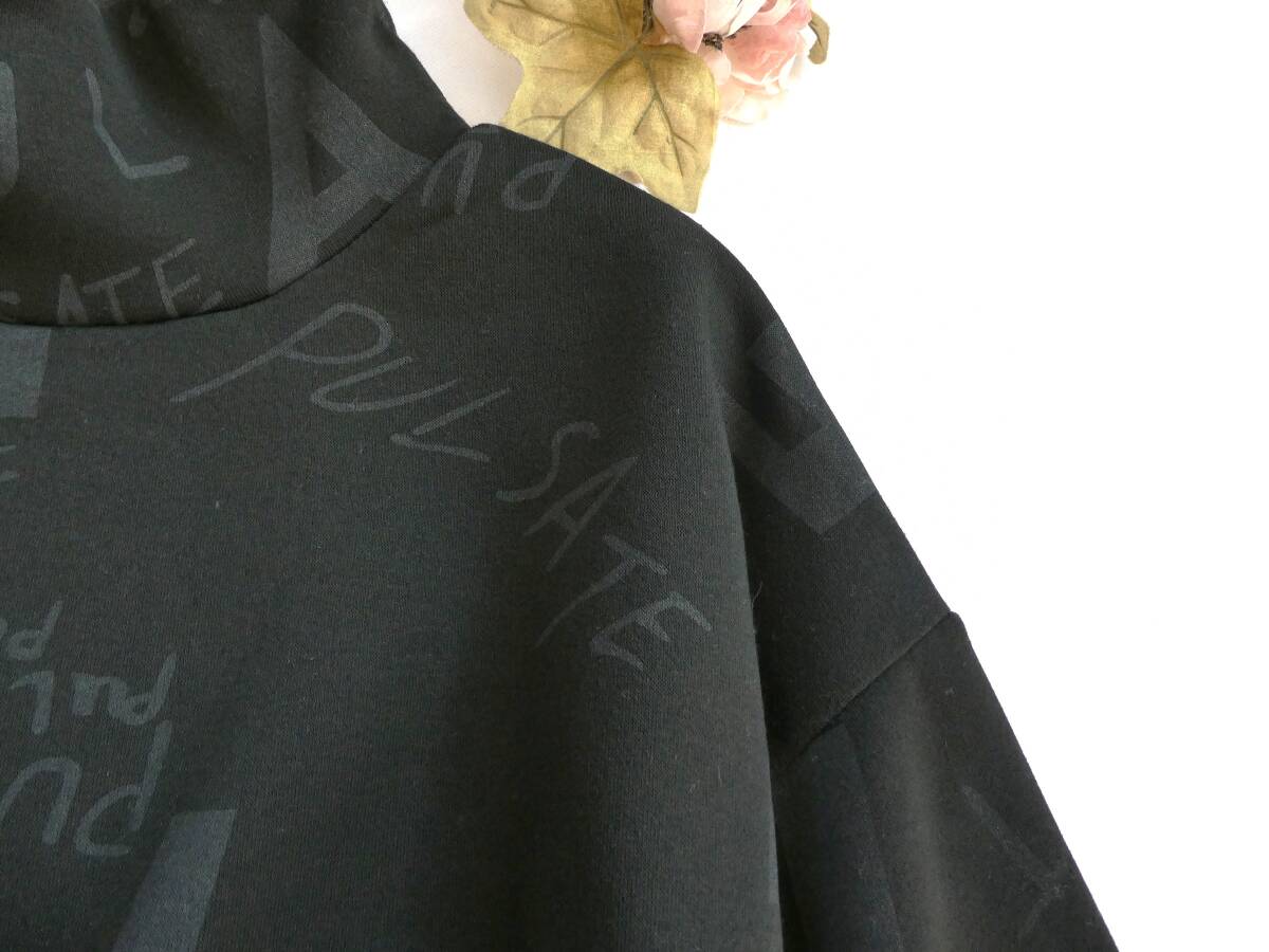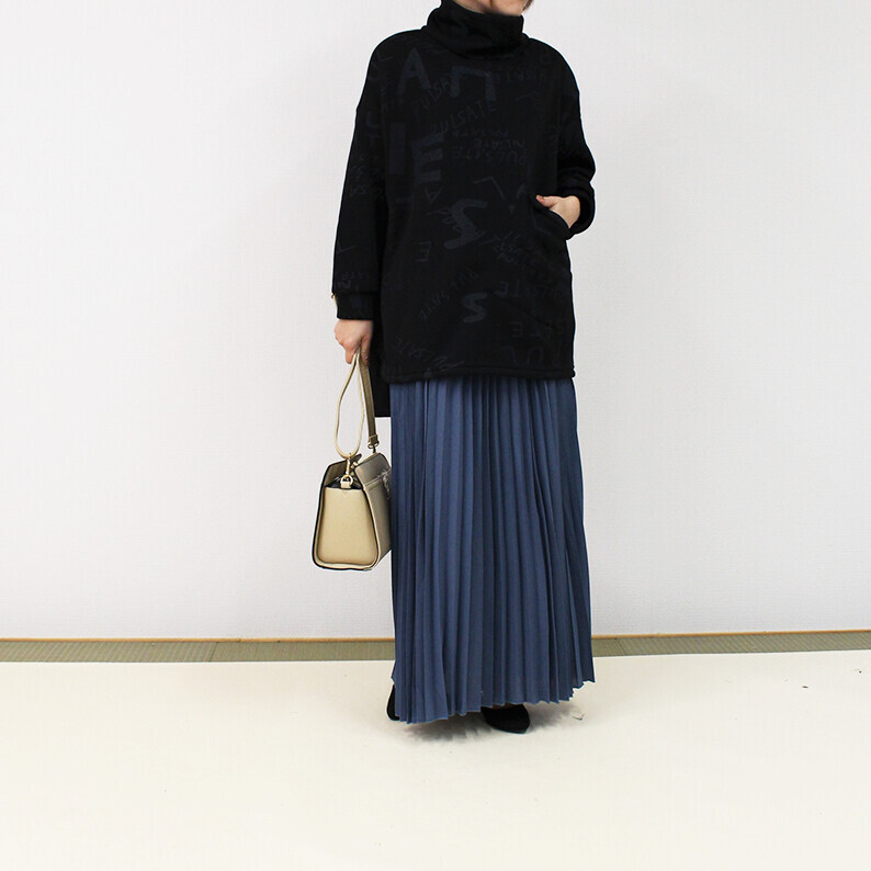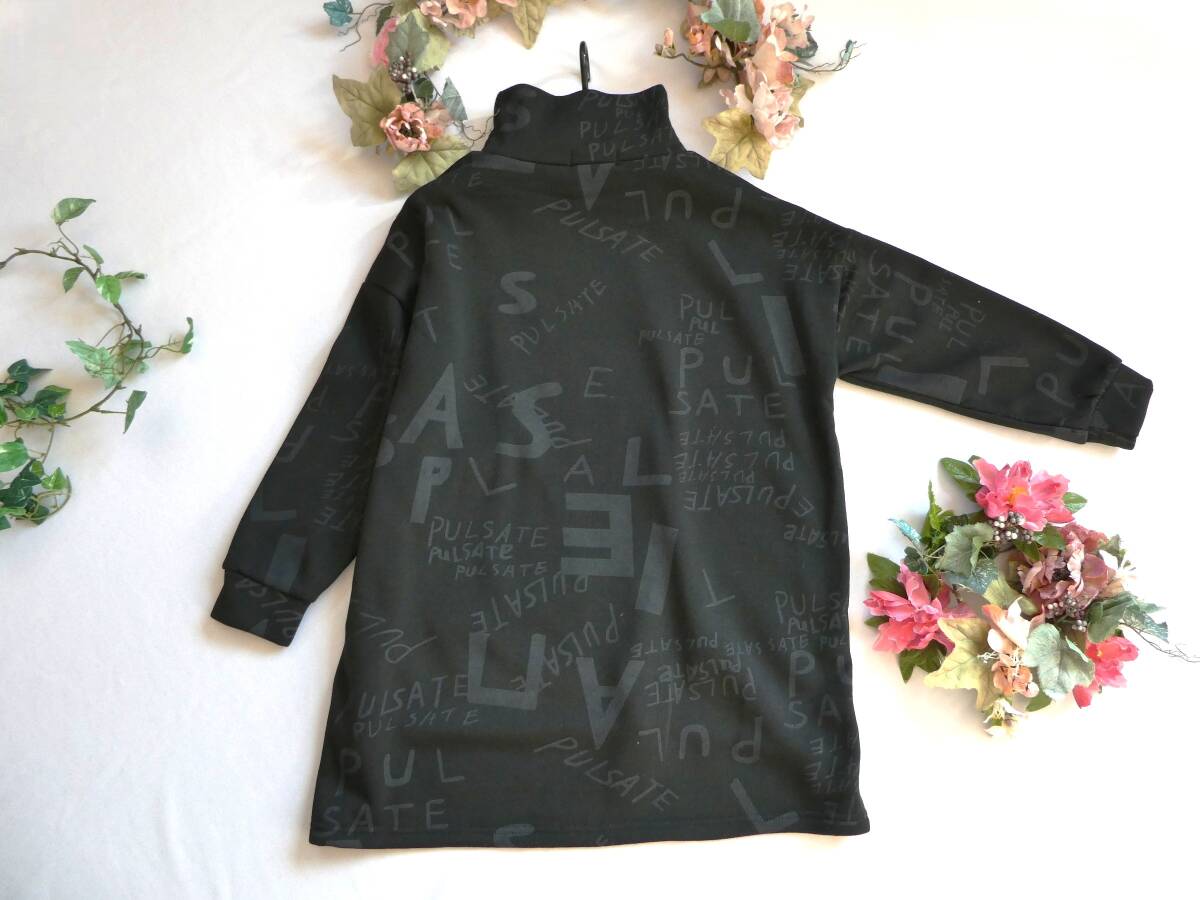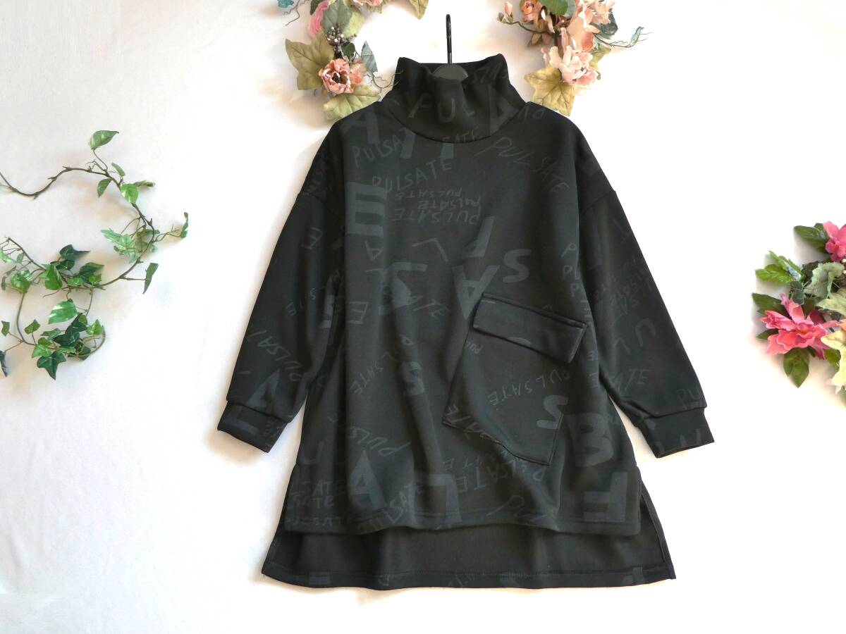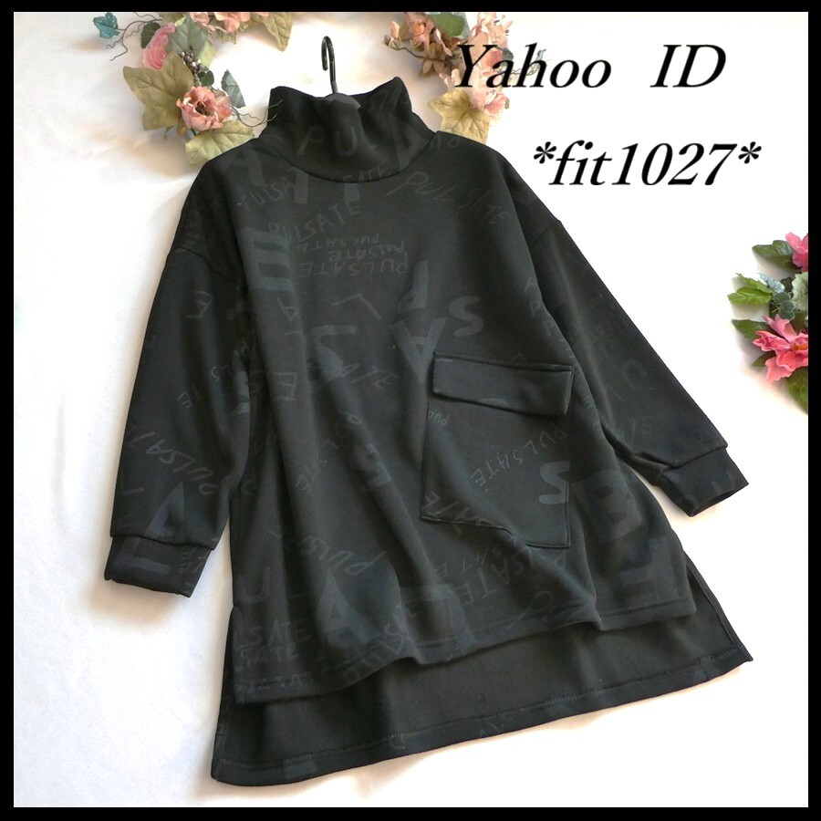 ゆったりサイズ【新品】カジュアル・裏起毛ニットソー素材♪英字アートプリント◇タートルネック☆ポケット付きチュニック・黒◆fit1027◆