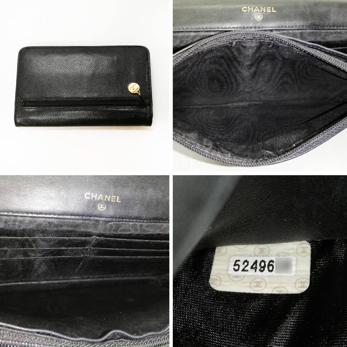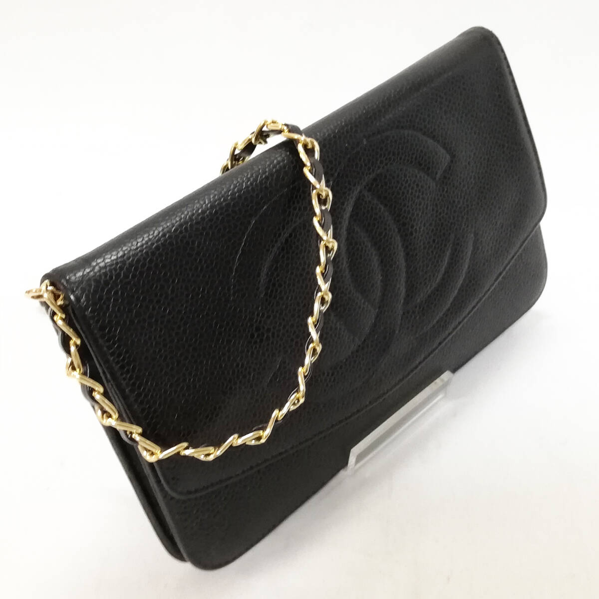 【良品】CHANEL(シャネル)キャビアスキン 二つ折り長財布 チェーンウォレット 黒 ブラック 可愛い おしゃれ 【送料無料】054