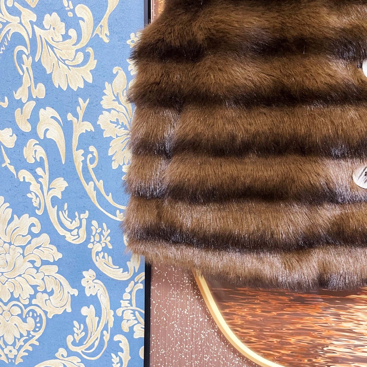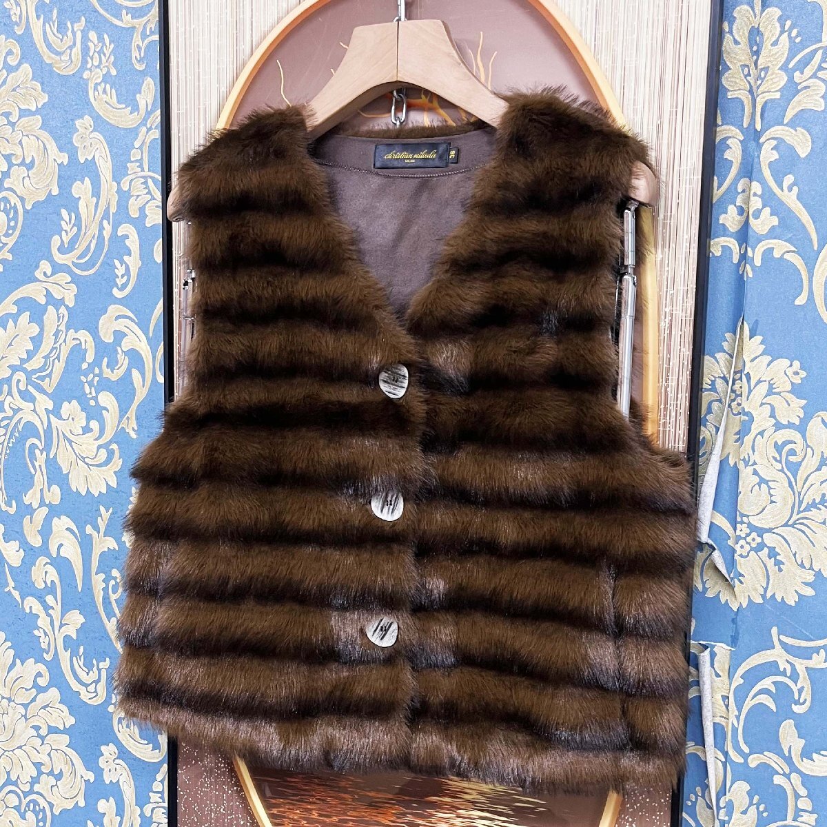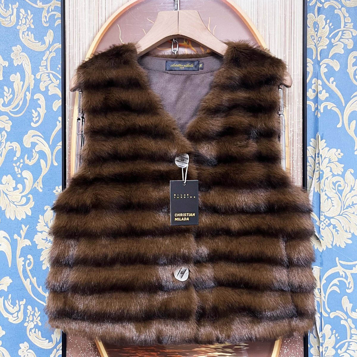 定価7万★christian milada・ミラノ発・ファーベスト★ミンク混 保温 個性 ソフト Vネック ストライプ柄 ノースリーブ 毛皮ジャケット デート レディース M/36サイズ