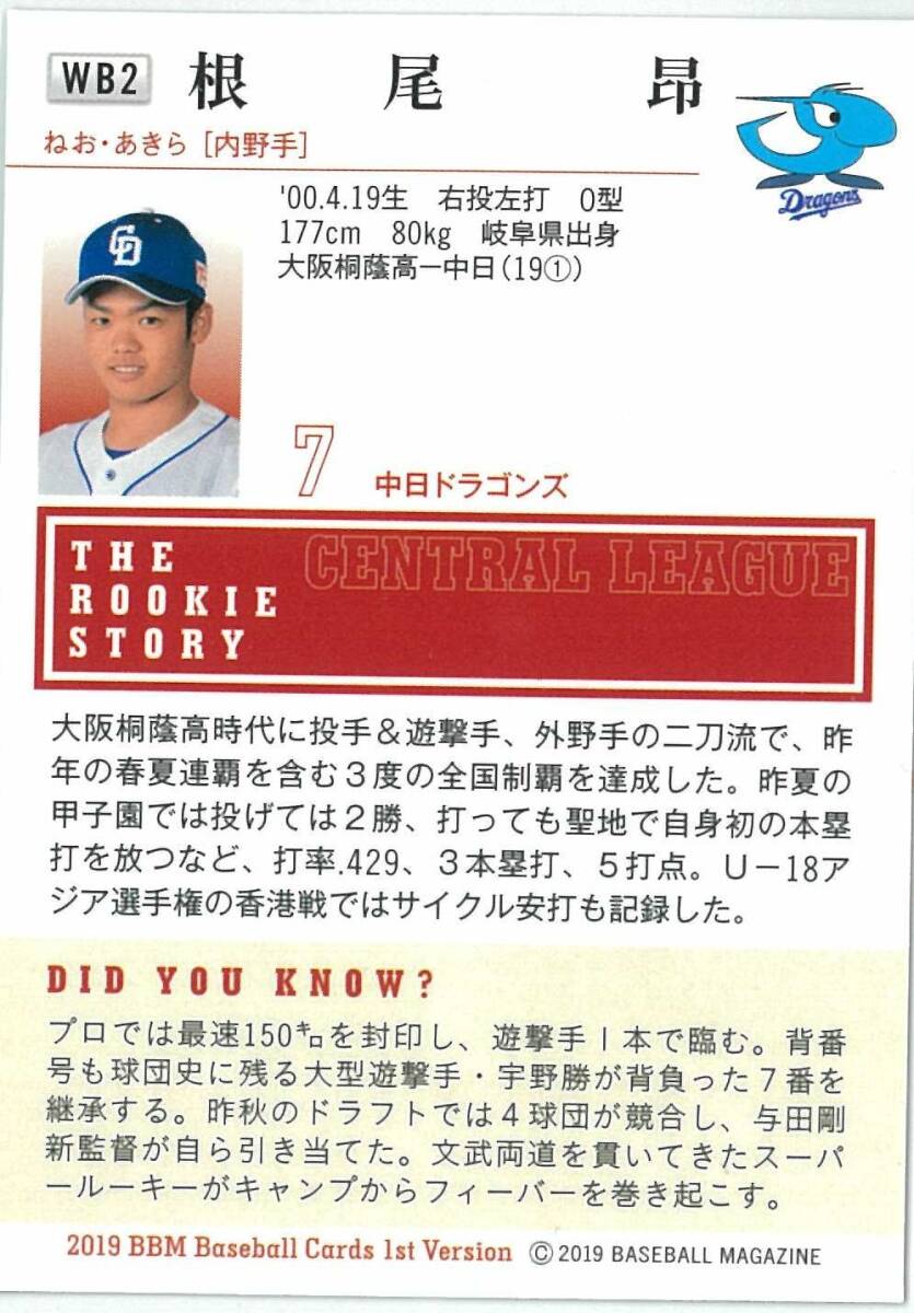 2019 BBM ベースボールカード 1st バージョン根尾昂[中日] 週刊ベースボール2019年4月22日号特別付録(送料85円~)