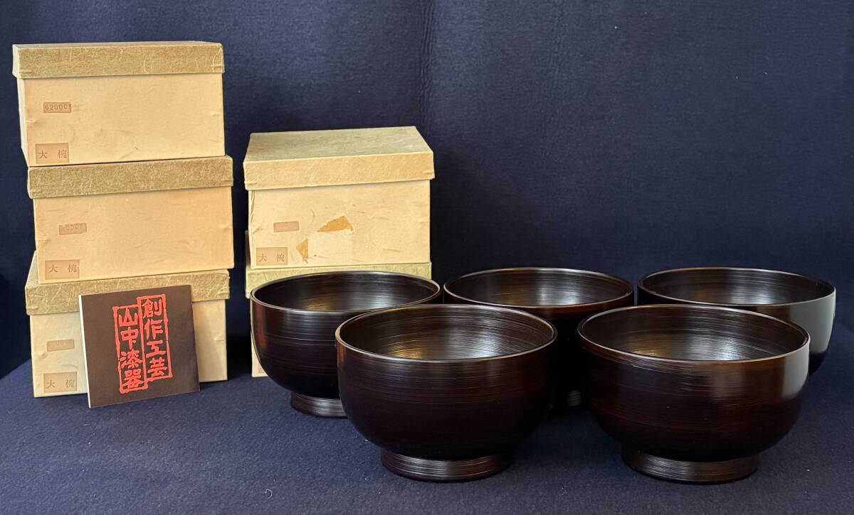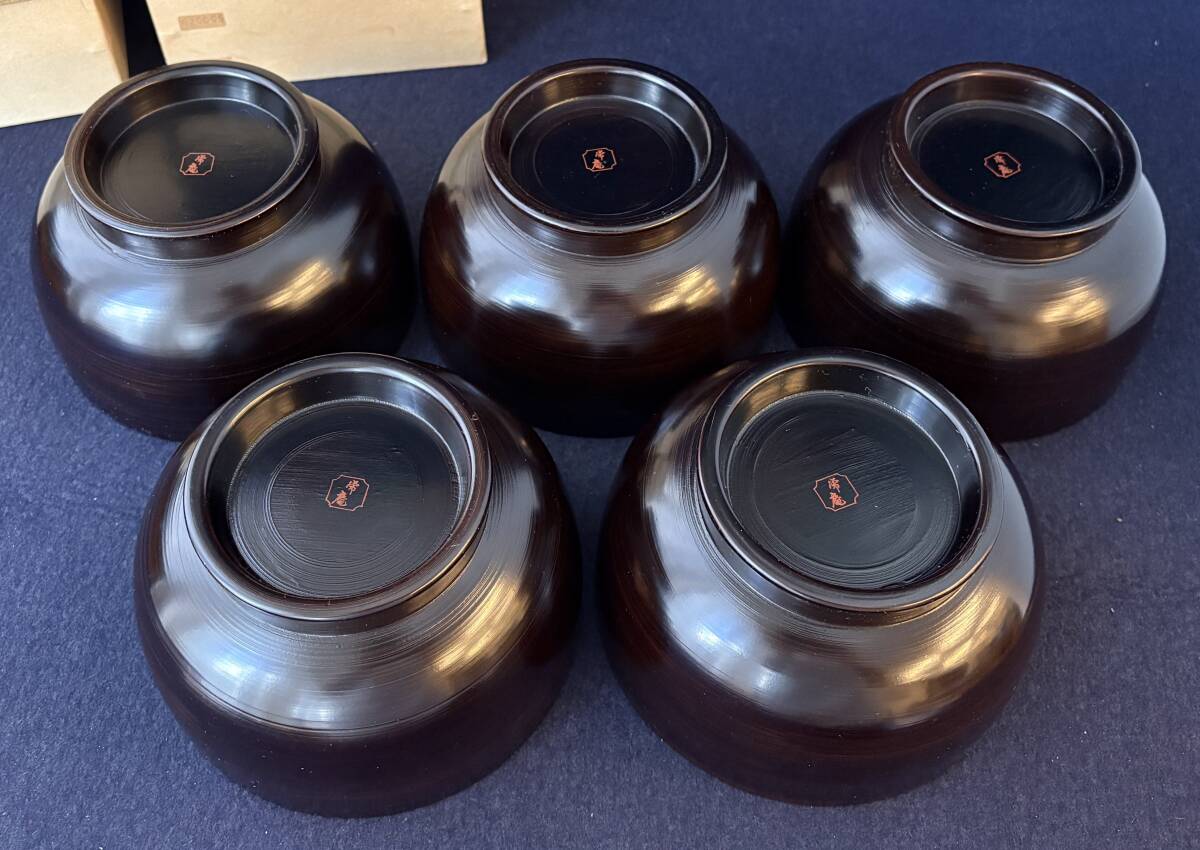 未使用 漆器 山中漆器 大椀5客 化粧箱付き 黒塗り 「常庵」 天然木 うるし塗装 漆塗り お椀 茶椀 木椀 懐石 会席 茶道具 漆芸 木工芸