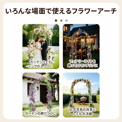 • 【上品な空間を作る、魅力的なガーデンアーチ】美しい曲線と繊細な装飾が、まるで夢のような特別な空間を演出します。庭や玄関先に置くだけで、空間が一気に華やかになります。ガーデンウェディングの入り口に。フェアリーライトを飾ってロマンチックに。ガーデンの飾りつけに。記念写真の背景としても大活躍。