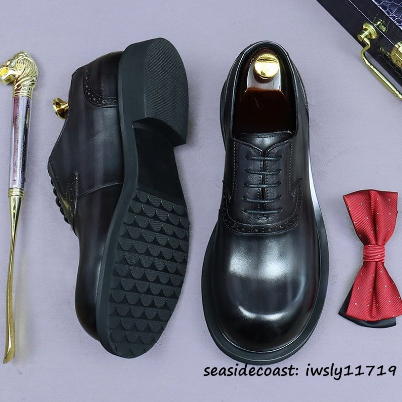 最上級◆定価10万 本革 ビジネスシューズ メンズ 本牛革 レザーシューズ 職人手作り 彫り 紳士靴 厚底 イギリス風 冠婚葬祭 グレー 25.0cm