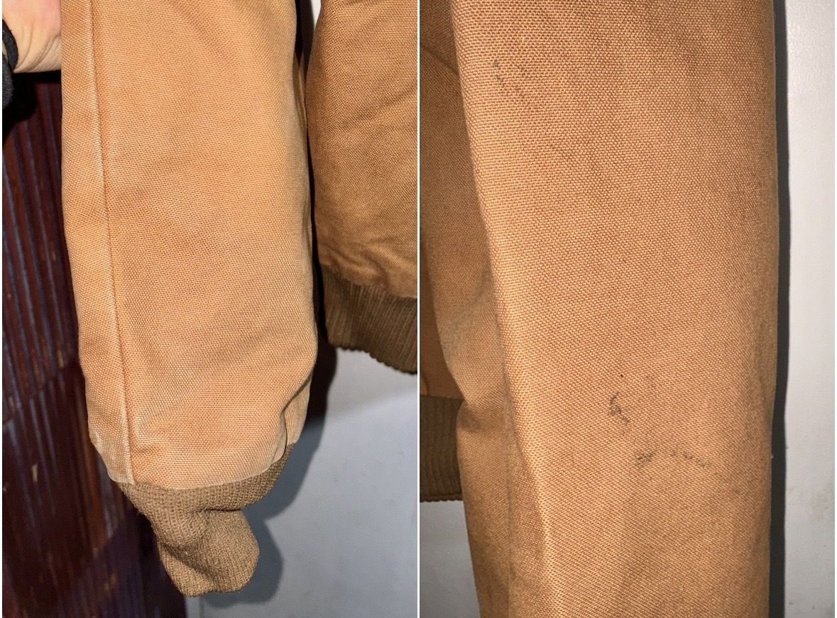 経年保管品です。10年ほど前に購入した物ですが、数回程度の着用です。腕部分に小さい汚れ、変色あり。