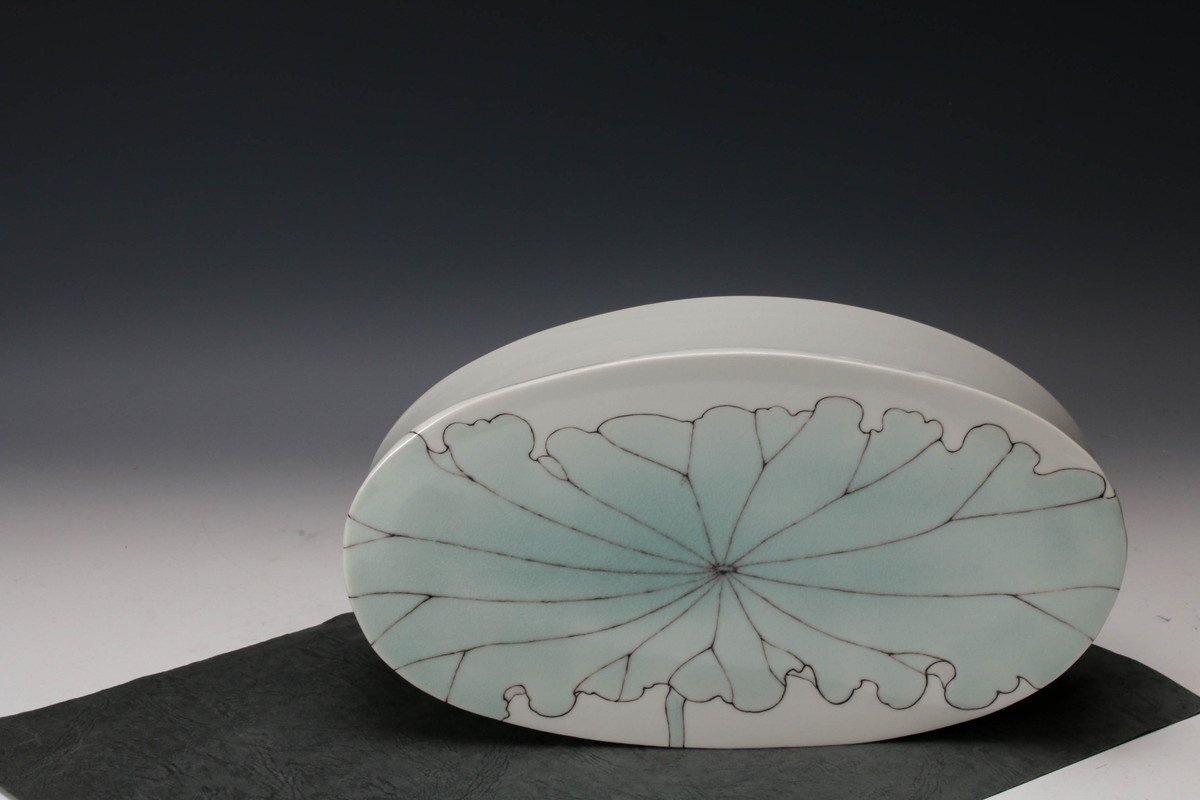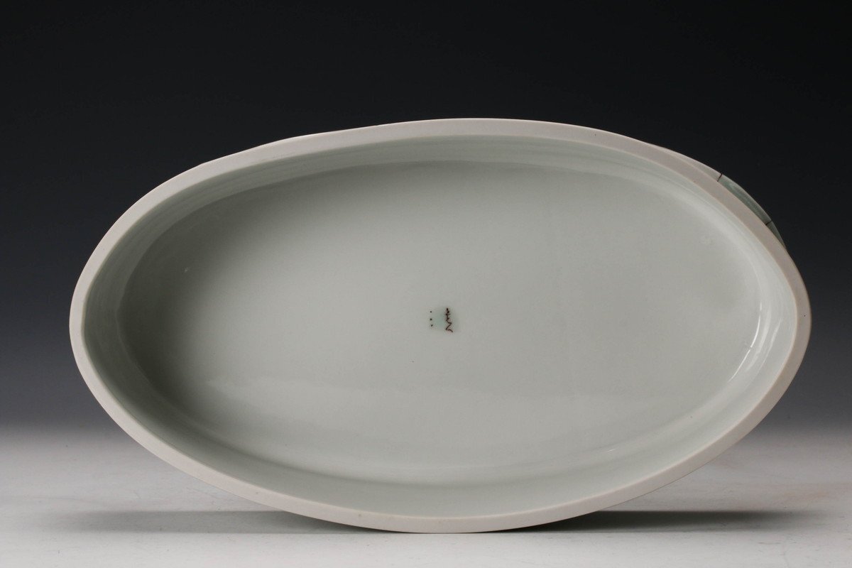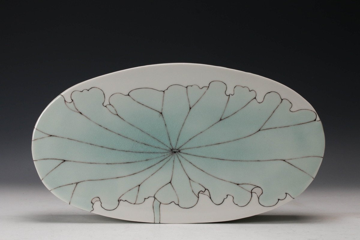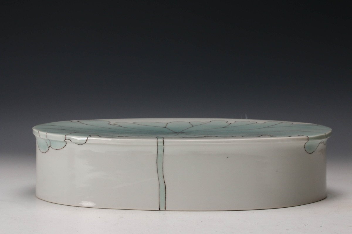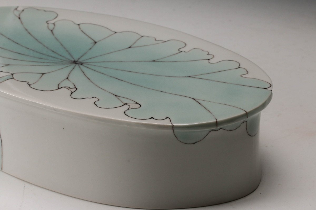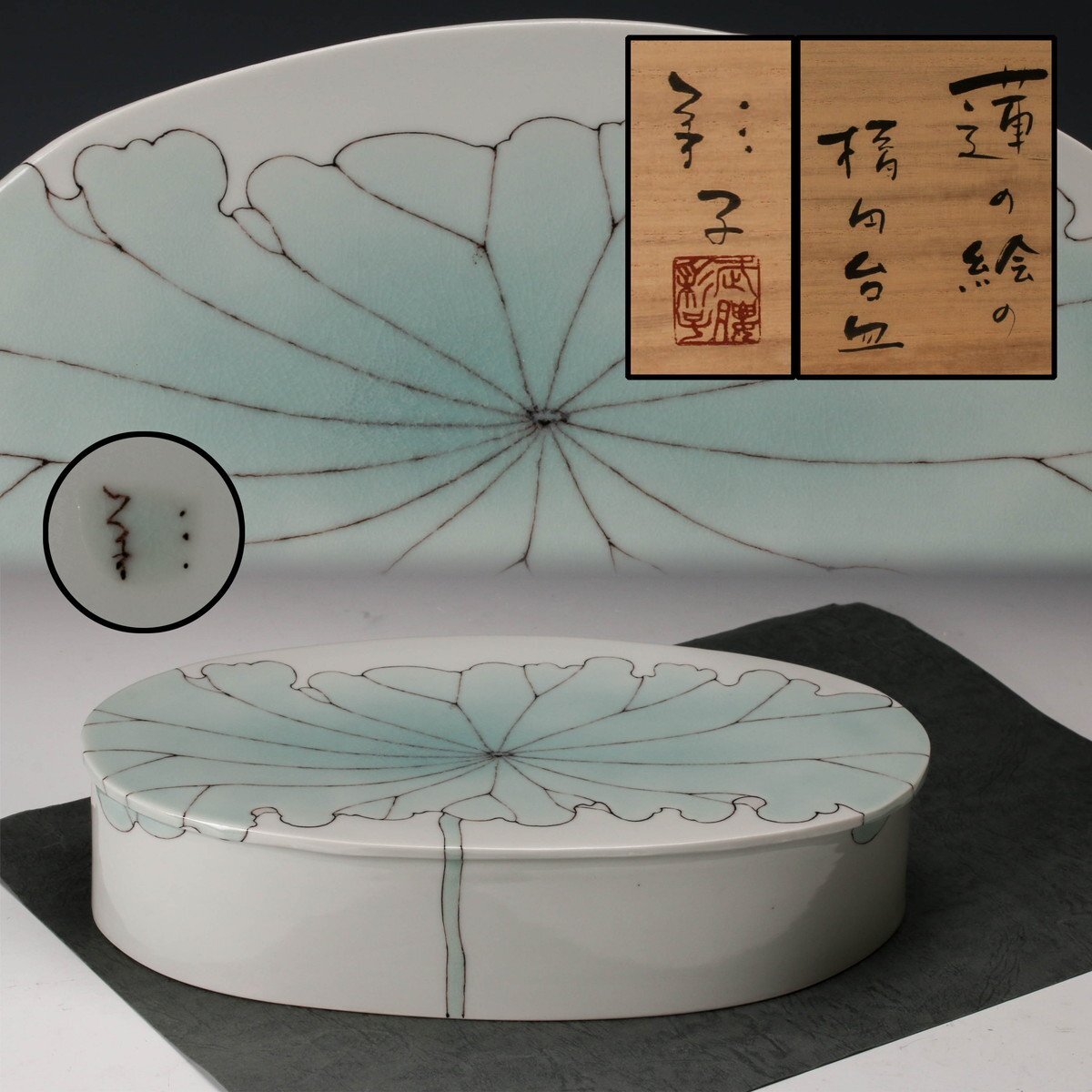 【佳香】武腰彩子 蓮の絵の楕円台皿 共箱 栞 共布 本物保証(父:武腰潤)