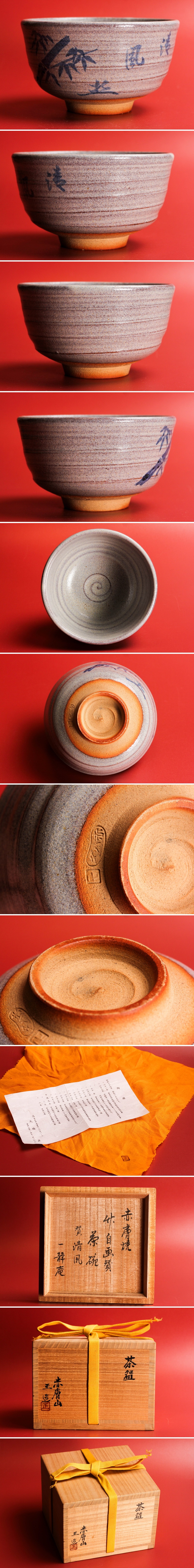 大塩正 銘『清風』赤膚焼竹自画賛茶碗 表千家一静庵【木村宗匠】書付 共箱 共布 栞 茶道具 本物保証