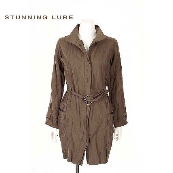 A5592/シワ加工 春夏 STUNNING LURE スタニングルアー コットン ステンレス混 ベルト付き 膝丈 ステンカラーコート 36 カーキ/レディース