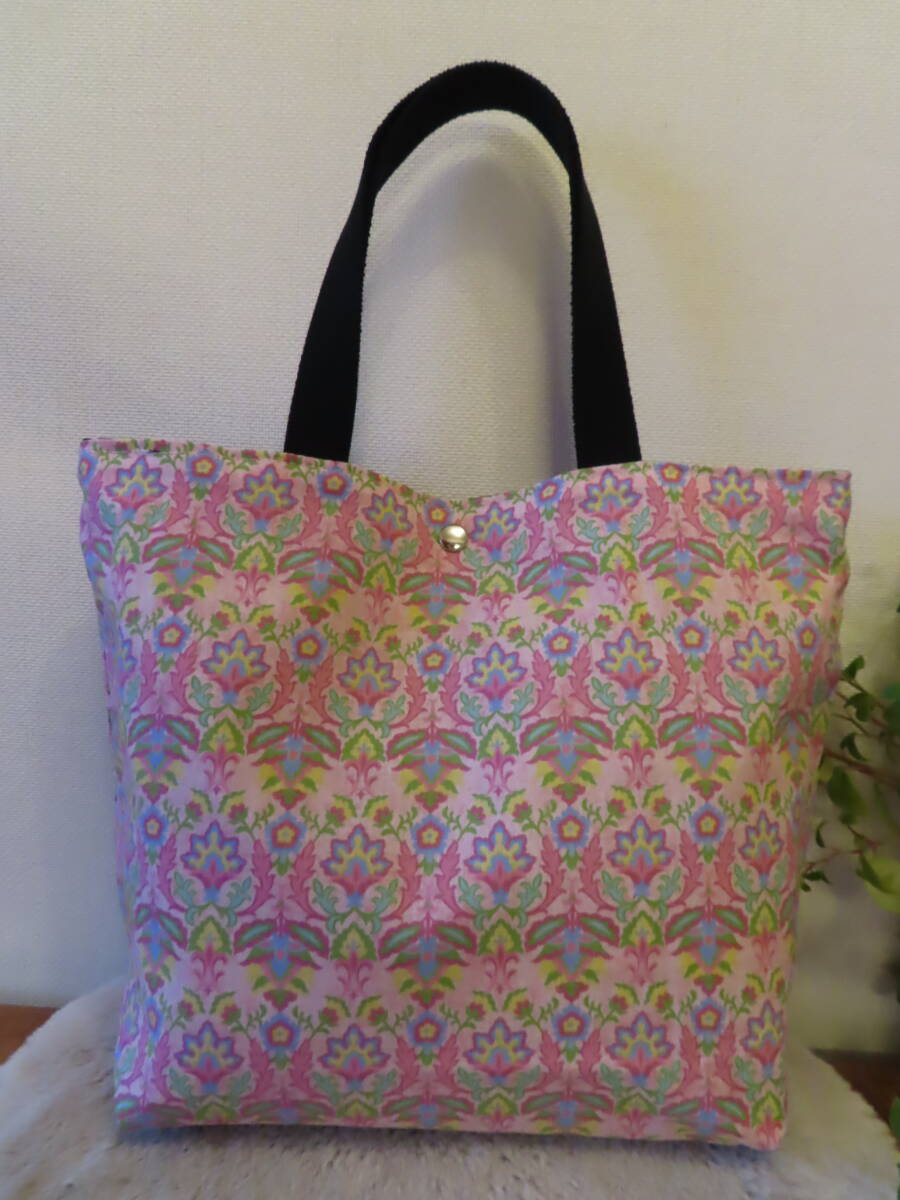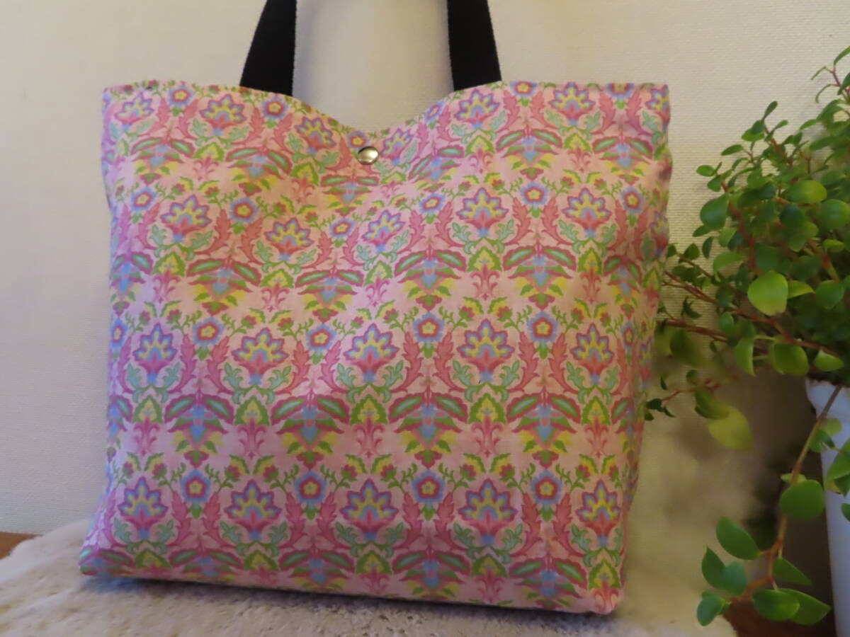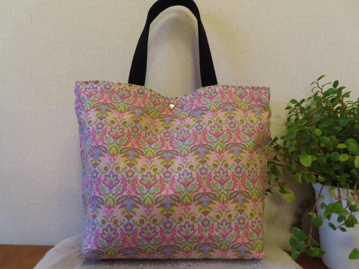 55 ハンドメイド サブバッグにも便利な 手提げトートバッグ 内布 撥水加工 ダマスク模様 ピンク プリント柄