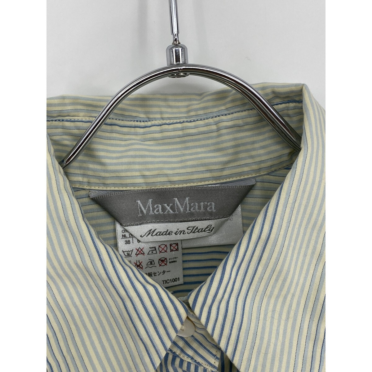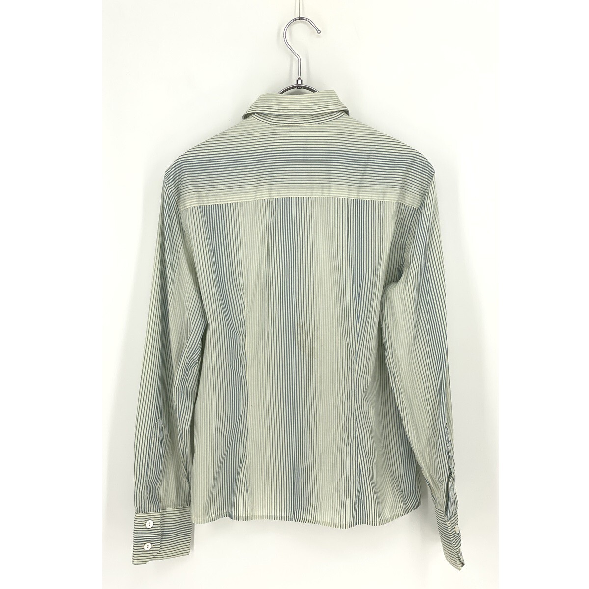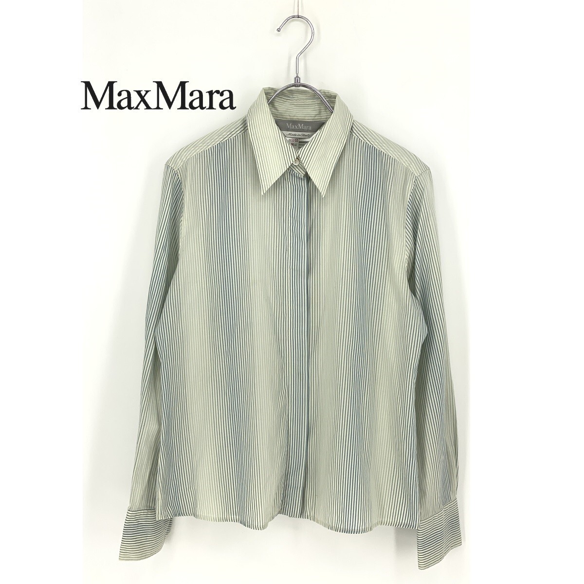 B0748/訳あり Max Mara マックスマーラ 銀タグ コットン ストライプ グラデーション 長袖 ドレス Yシャツ ブラウス 42 XL 青 緑 レディース