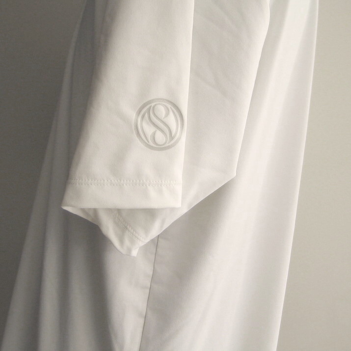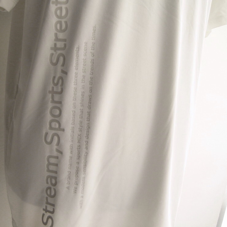■モードな印象を際立たせる光沢感のあるロゴプリントをボディと左袖に配し、さりげなさの中にデザインポイントを加えています