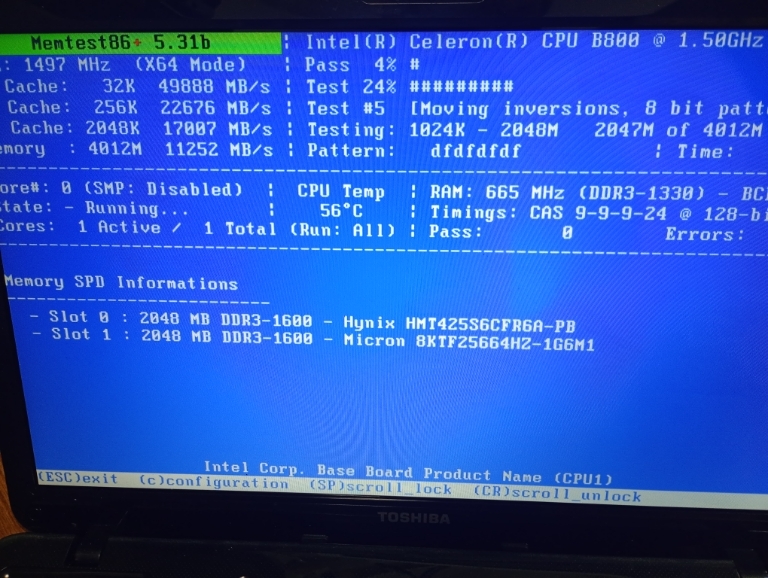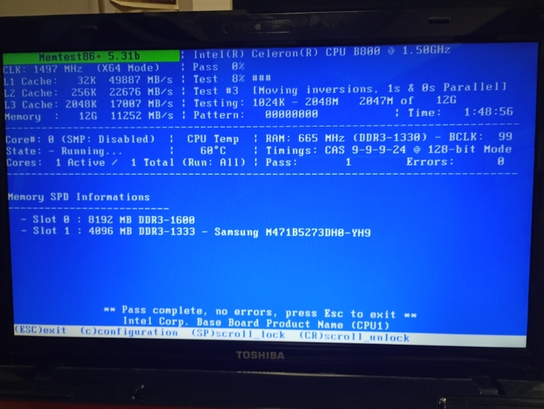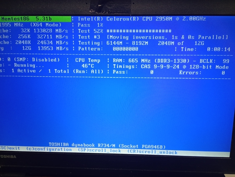 | 商 品 説 明 | ≪検査機≫: ・東芝R734/M改 (Cel 2950M) 画像7 起動確認 ・東芝T451/58ER改 (Cel B800) 画像8 Memtest86+ 5.31b 1ラウンドpass (# 画像9は後述の参考画像。当商品2枚挿しの結果ではありません) ≪Memtest86+ 5.31b ≫ 画像8 ▲右中段 RAM: 665MHz (端数無視) DDR3-1330 (端数無視) タイミング: CAS 9-9-9-24 ▼左下段 スロット0: DDR3-1600 スロット1: DDR3-1333 ・右中段が動作している結果 ・左下段がメモリを挿された時点の物理的な結果 *********************************************** スロット0=画像1上● 8gb PC3L-12800 = SunEast スロット1=画像1下● 4gb PC3L-10600 = Samsung 上段のメモリが下段のロースペックに引きずり込まれて DDR3L-1333 計12gb として動いている形です (当機の場合はDDR3-1333)。 どうしても DDR3L-1333 で動かす必要がある方向け。 お手持ちパーツの組合せにより【ご自身でこの形を造れる方】は、わざわざ当商品を購入なさる必要がありません。 |