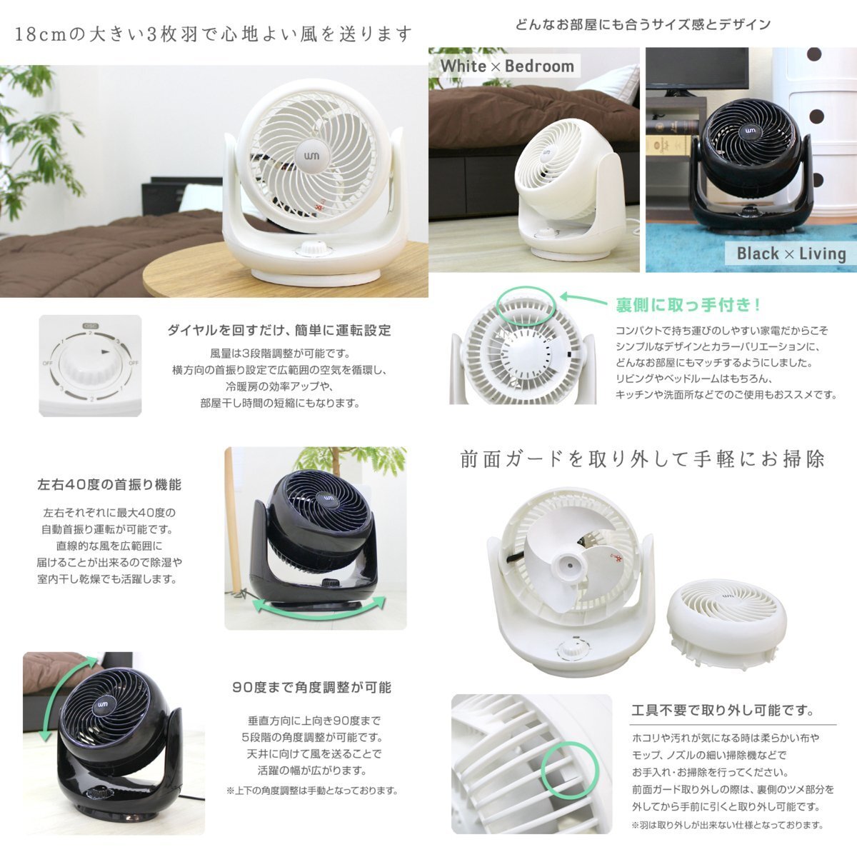 | 【商品仕様】 パワフル送風のコンパクトサーキュレーターです。 直線的なパワフル送風で室内の空気を循環させ、 夏は冷房、冬は暖房効率を上げ一年中使えます。 温度設定を抑えられるので消費電力が少なく省エネにつながります。 自動で左右に首を振る首振り機能付き! 3段階の風量調整と正面から上90度まで縦方向角度調整ができます。 室内の空気の循環以外に、洗濯物の乾燥、部屋の換気、隣室への空気の送り込みなどに使うこともできます。 梅雨時期は、部屋干しの生乾き対策に使用するお家も! コンパクトサイズなので、 湿気の溜まるクローゼットや押し入れのカビ防止にもぴったりです。 【商品内容】 カラー:ブラック 機能:自動首振り左右 サイズ:(約)幅30×奥行21×高さ31cm 重量:(約)1.9kg 風量調節:3段階 角度調整:5段階(~90°5段階) 適応床面積:~14畳 コード長:(約)1.6m 電源:AC100V 50/60Hz 消費電力:42W 素材:ポリプロピレン |