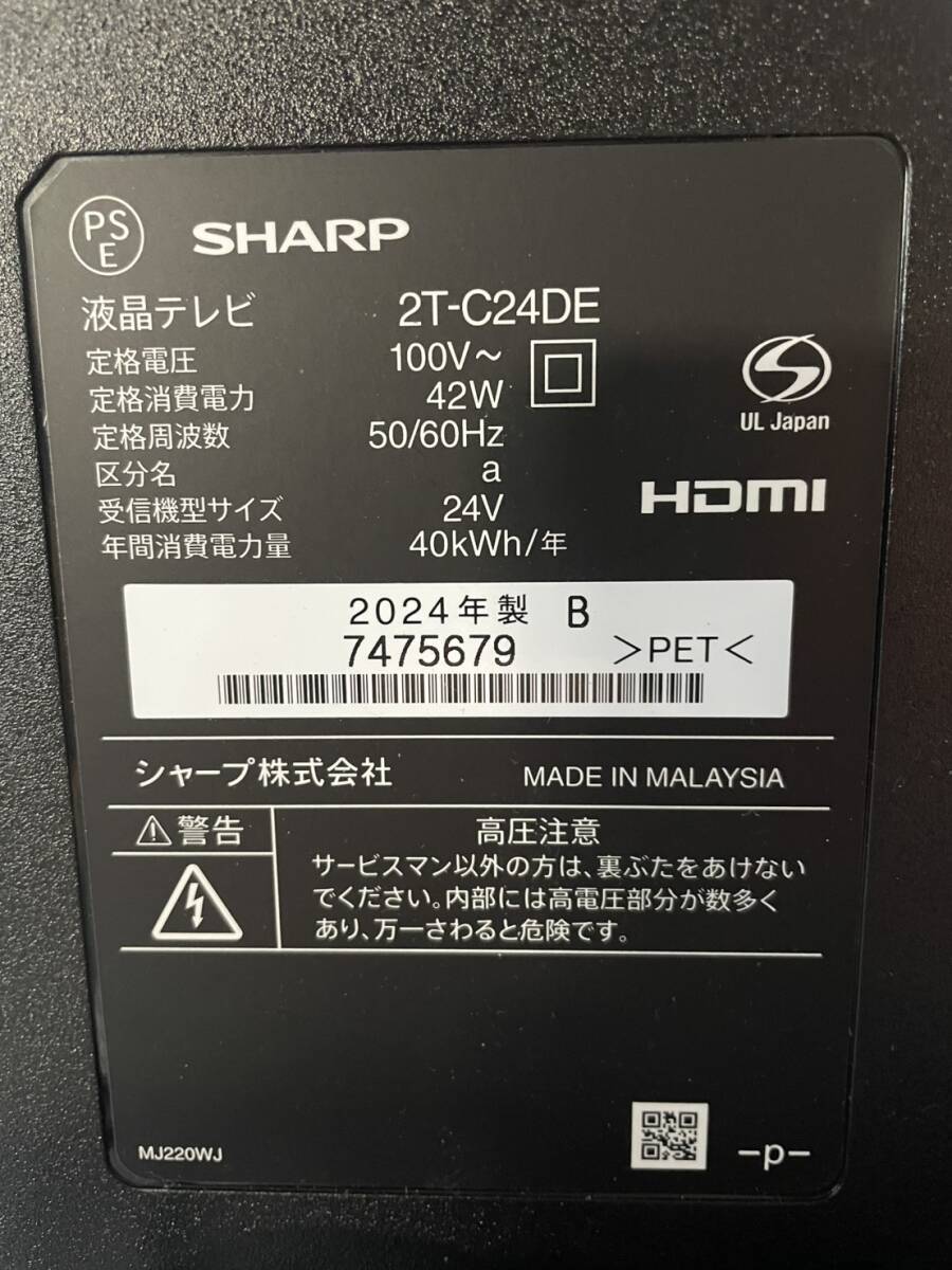 | SHARP/シャープ/AQUOS/アクオス/液晶カラーテレビ/TV/24V型/インチ/2024年製/2T-C24DE/1208b | ||||||||||||||||||||