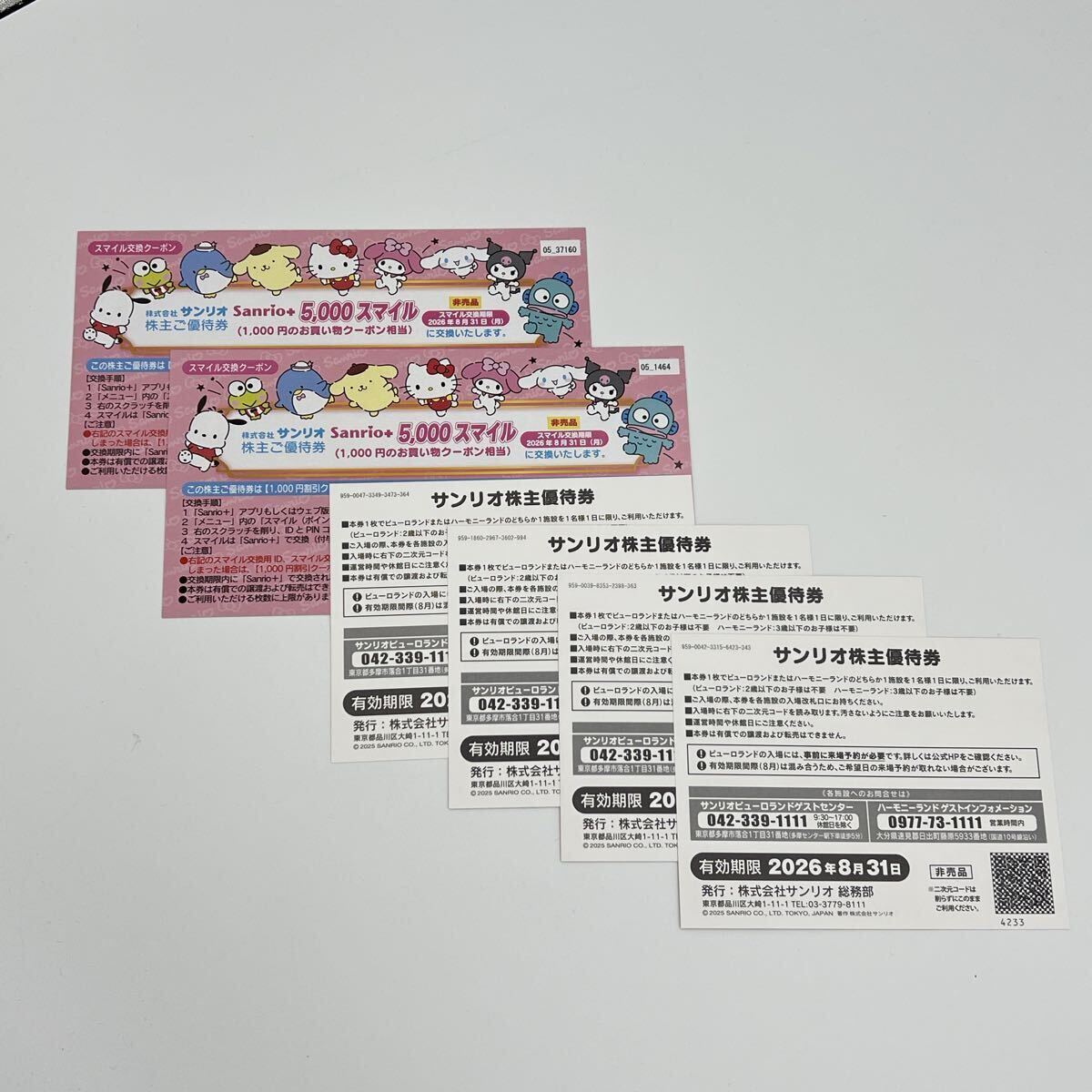サンリオピューロランド、ハーモニーランドの共通優待券 4枚、サンリオショップ、サンリオオンラインショップで使用可能な株主優待券1000円分(または5000スマイル) 2枚、その他、株主優待送付時に同封されていたパンフレットなどです。発送はリユースの封筒を再利用させていただきますのでご了承ください。