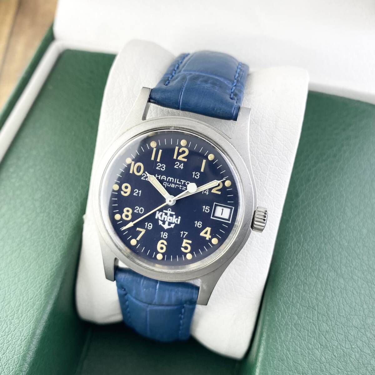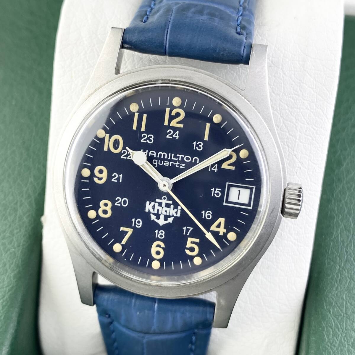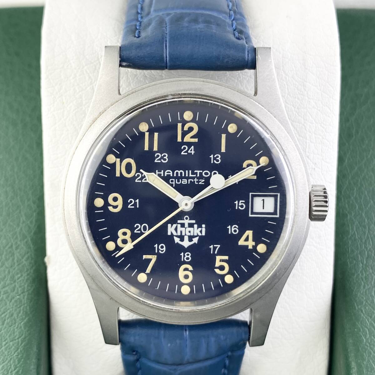 【1円〜】HAMILTON ハミルトン 腕時計 メンズ KHAKI カーキ 9797 錨マーク ブルー文字盤 ラウンドフェイス デイト 可動品 | |||