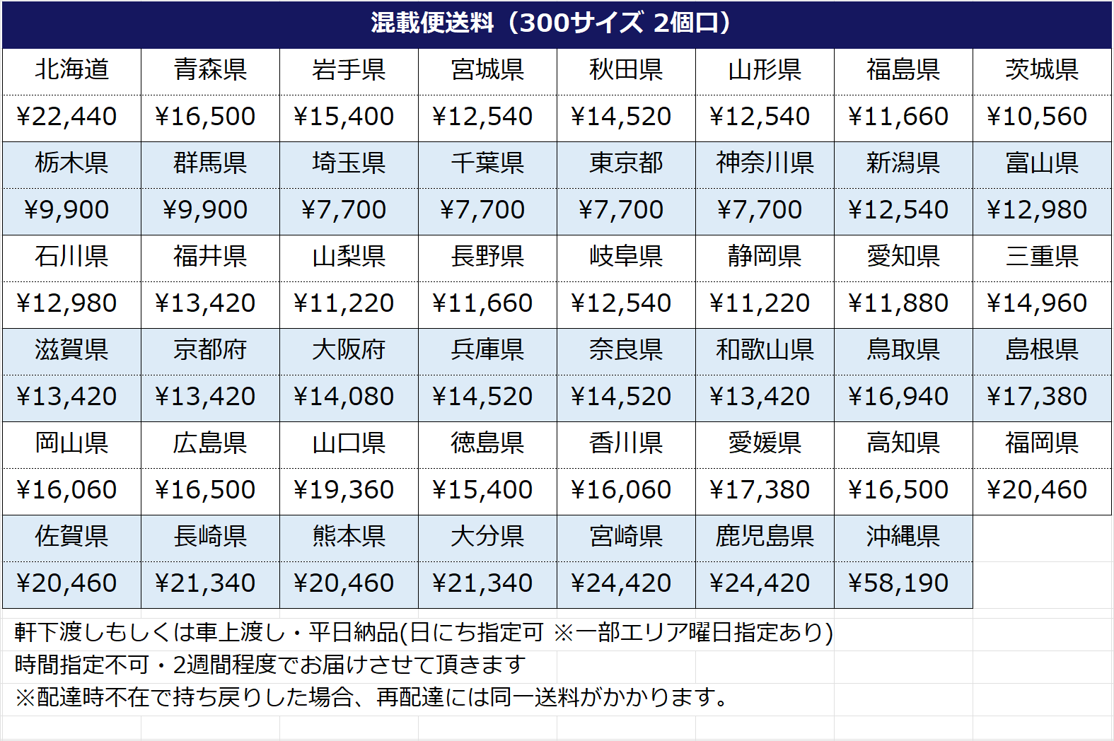 以下配送方法をご案内させて頂きます。 ご落札金額(税込み)+送料の合計をお支払下さい。 ※複数点ご購入の場合、落札数量×都道府県別料金=送料金額となります。 |