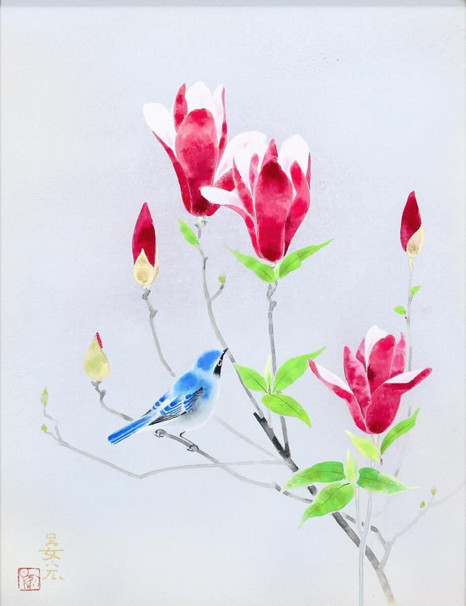 【真作】【WISH】沼田晏宏「朱木蓮」日本画 6号 金落款 金泥仕様 共シール ◆朱木蓮に寄り添う青きさえずり   〇日展会友 #25122473