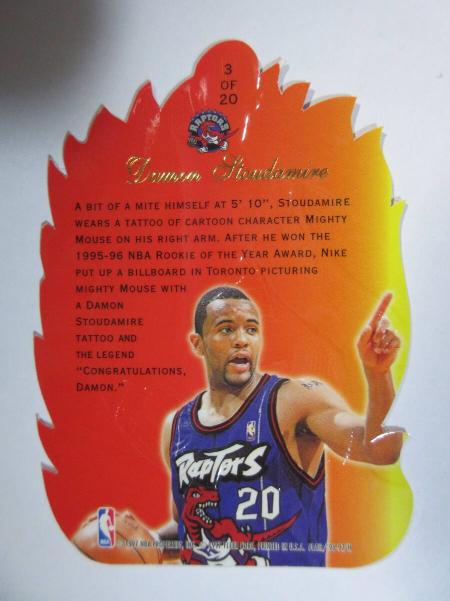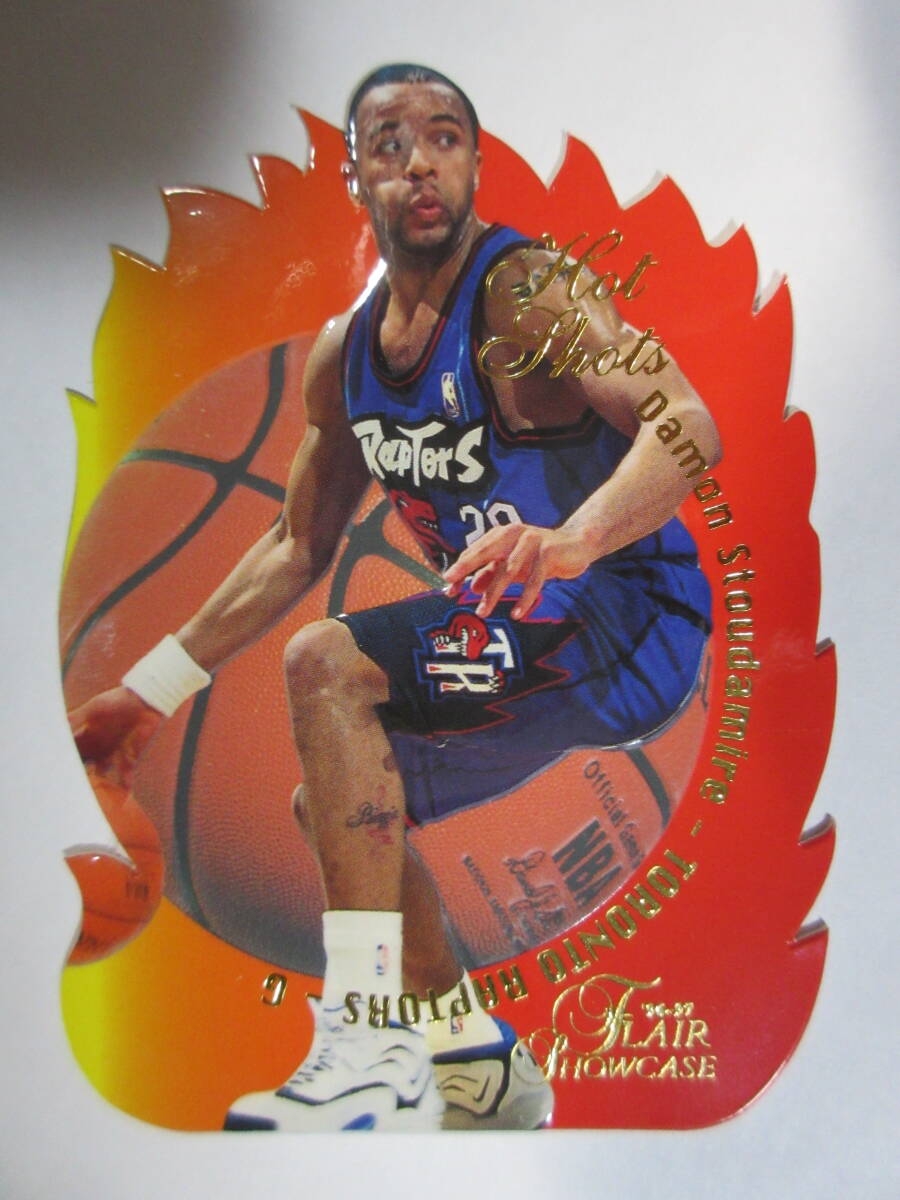Fleer社発行の、「1996-97 Flair Showcase basketball」に封入されていた、1995年ドラフト1巡目(全体7位)でトロント・ラプターズから指名を受け入団、PGとして13シーズンプレーしたデイモン・スタウダマイアー元NBA選手、人気で貴重なインサートカードの一枚、ダイカット加工の「Hot Shots」カードです。