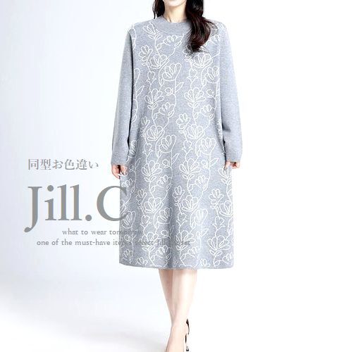 上質感◎フラワー&リーフ ジャガードが美しい(背面は単色無地)しっとり柔らかなハイゲージニットワンピース。程よい厚みでごわつかずストンと着られて気になるスタイルもしっかりカバー出来ます。春・秋冬とロングシーズン大活用いただけます。寒い季節はコート下にも最適。ネック周りは着脱しやすいリブ仕様。1枚で存在感のある着映え&高みえするお出かけアイテム。通勤オフィス対応のきちんと感もございます。嬉しいゆったりサイズです♪