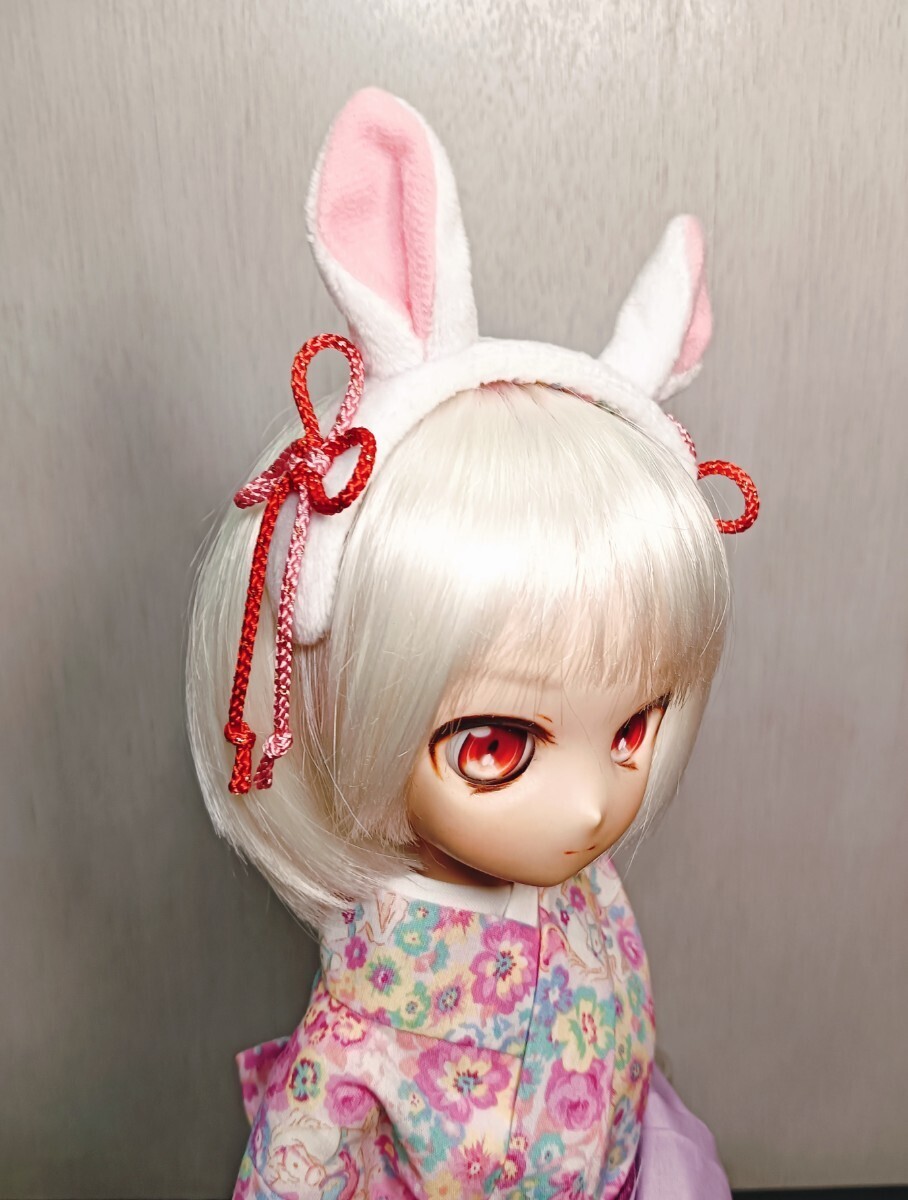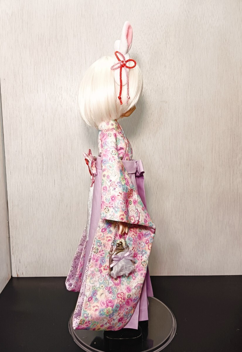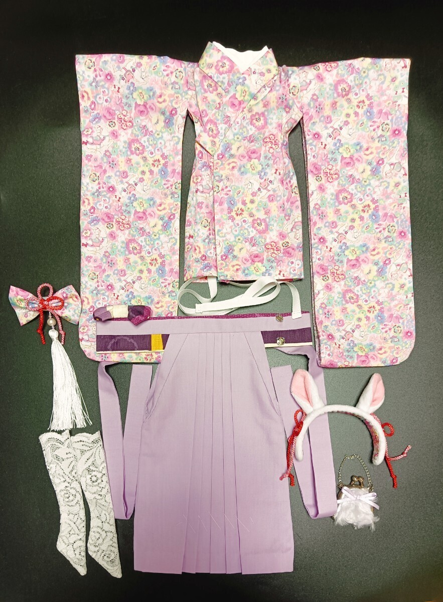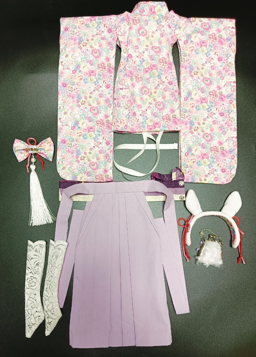 ミニドルフィードリーム用、着物風ブラウスと簡易式袴、馬耳カチューシャ、タッセルブローチ、がま口バッグのセットです。