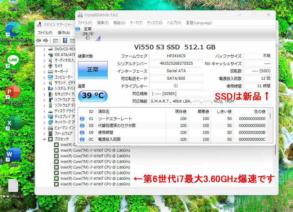 CPU  Corei7 6700T-ターボ時3.60GHz (第6世代4コア8スレッド)/メモリー 8GB(増設)/SSD 512GB(verbatim製の新品)/DVDドライブ