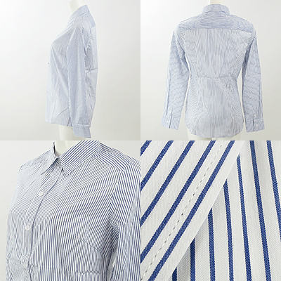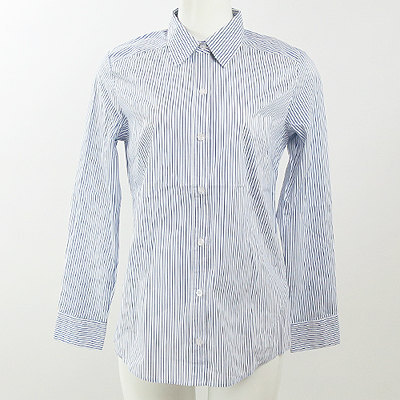 | 爽やかな配色のストライプシャツ☆ コットンストレッチ素材で美シルエットが特徴です。 オンオフ問わずに使える優秀アイテム。ワードローブにどうぞ☆ 使用感が少ない、状態の良いお品です。 着丈約61cm 袖丈57cm 肩幅36cm バスト約90cm 【サイズ】:(2) 【素 材】:(綿65%・ナイロン33%・ポリウレタン2%) 【 色 】:(ブルー) 【程 度】:(A) **** 7172-20150413-004 355 015 | ||||