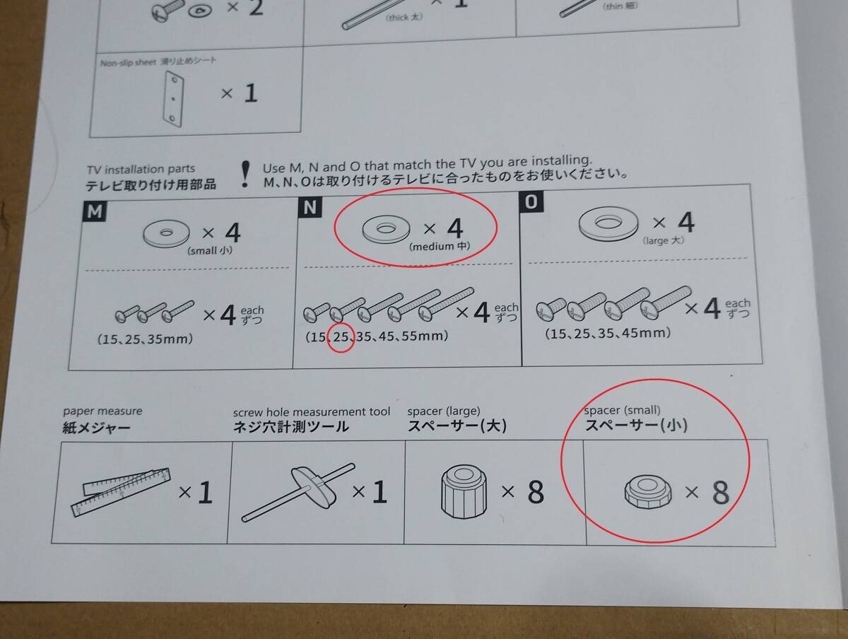 | スペーサー (小) | 8個 | ネジ穴とテレビ裏面の隙間調整用 |