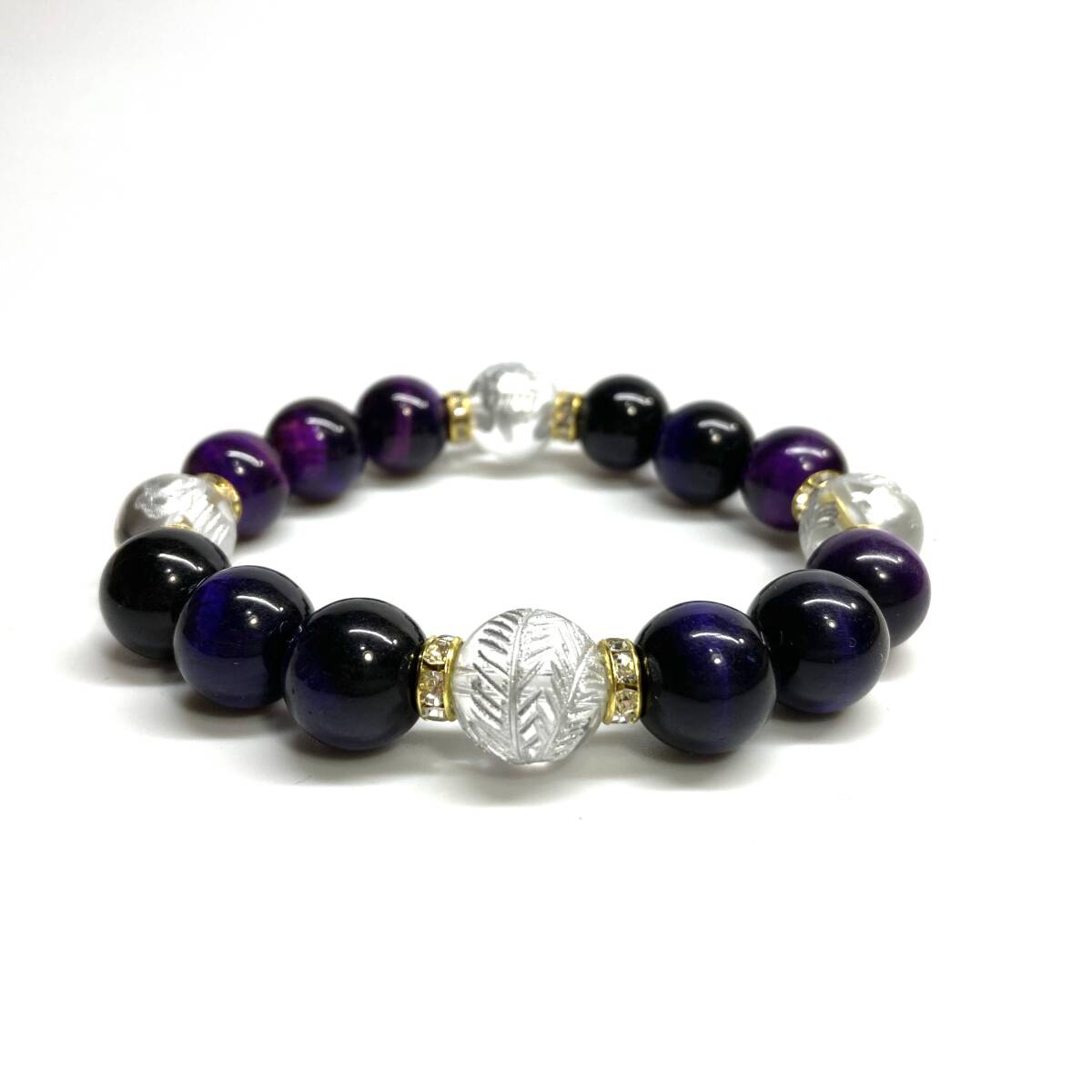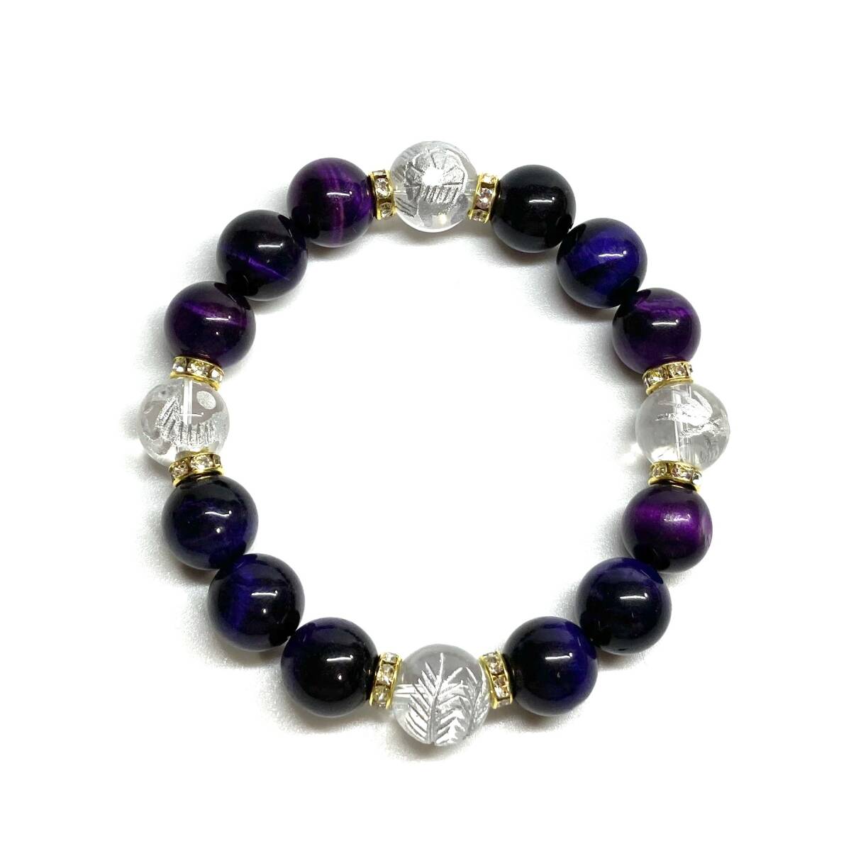 こちらは、四神獣銀彫水晶とパープルタイガーアイを組み合わせたパワーストーンブレスレットです。四神獣は、中国の伝説で4つの方向(東西南北)を守護する神聖な神。四神獣、厄災から身を守り、多くの運気を呼び込むと言われております。石大きさは程よくインパクトのある12mm玉で内周 約17cmです。 数に限りがございますので気になる方はお早めにどうぞ。