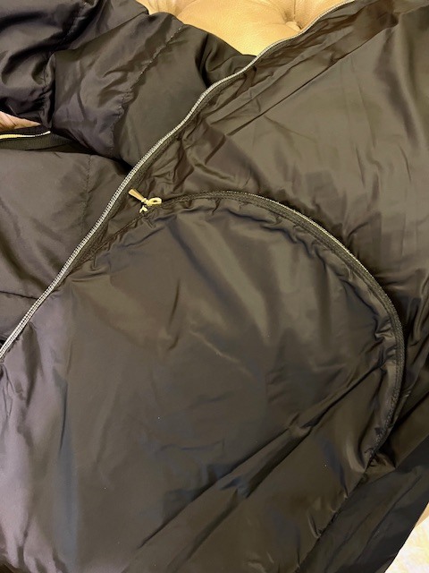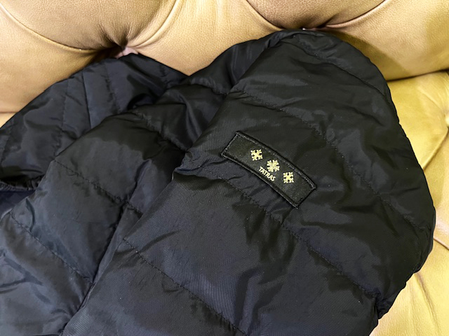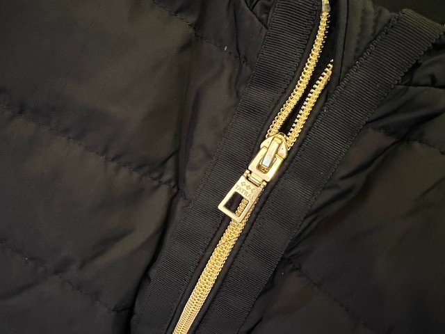 ●コートのインナーとしても使えるライトダウンで、折りたたむと内側のポケットに収まります。タグのリボン部分は現行デザインとは違い、可愛らしいミントグリーンです。