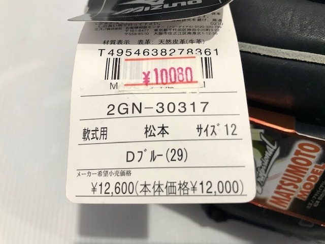 あ//J0521【未使用・保管品】Mizuno ミズノ 一般軟式用グローブ プロフェッショナル 松本哲也(ジャイアンツ) 外野用2GN-30317 サイズ 12