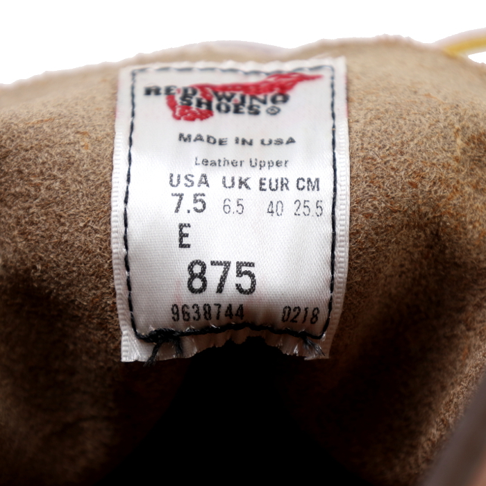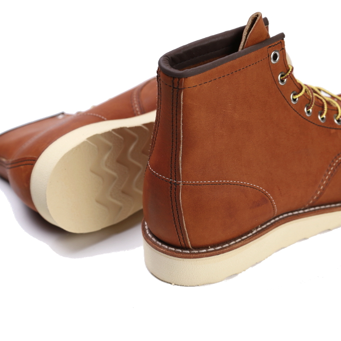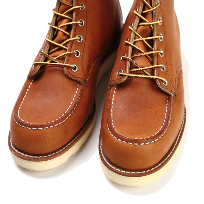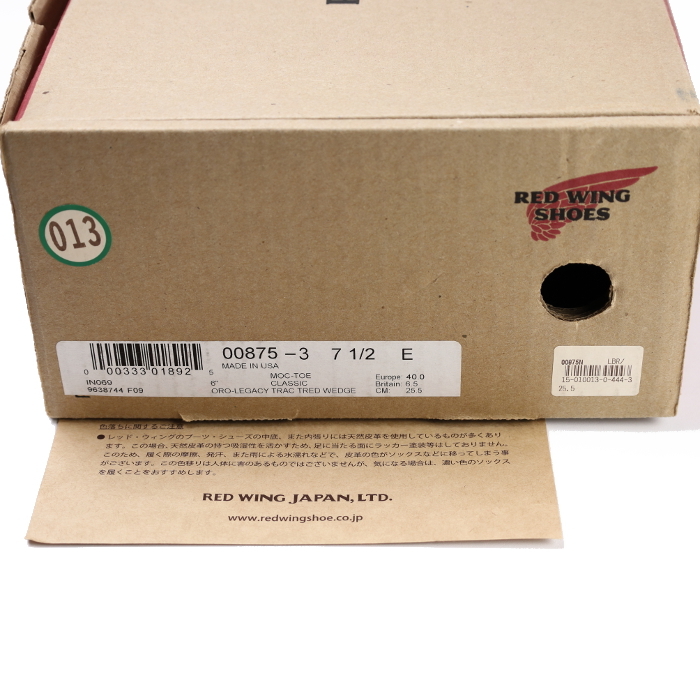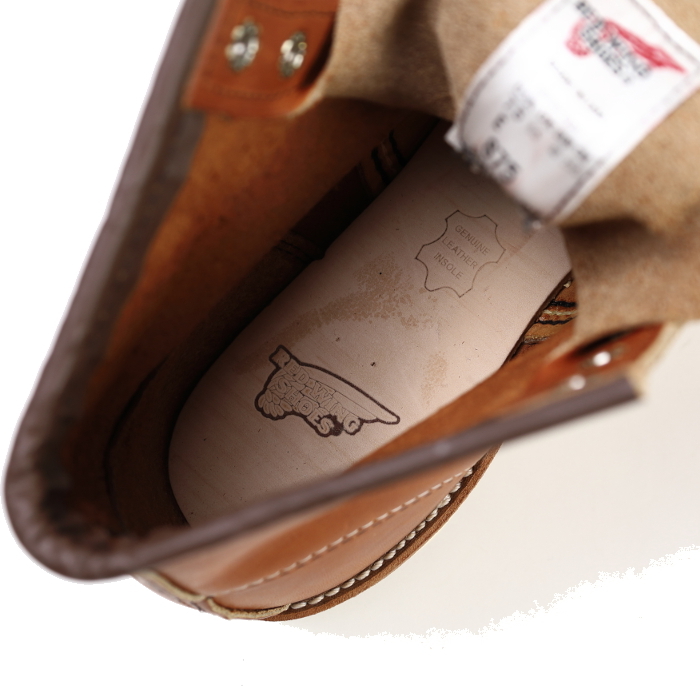 ■REDWING 6inchクラシックモック レッド・ウィング社は1952年、白く底が平らでクッション 性に富むトラクショントレッド・ソールを、ワーク・ハン ティングを用途とする男性用のブーツに初めて導入し、 発売しました。8インチ丈のブーツ#877です。 このブーツは発売と同時に大成功を収め、数年で様々な バリエーションが広がりました。6インチ丈の#875もその ひとつです。 モカシンタイプのつま先などが持つ履きやすさ。どのような 場所でも歩きやすく長時間履いても疲れにくいトラクション トレッド・ソール。 さらに、良質なオイルドレザーや堅牢なつくりがもたらす 機能性と耐久性で、#875は#877と共にワーカー達に絶大な 支持を得て、アメリカを代表するワークブーツとなり、 その後約65年経った現在でも、レッド・ウィングを代表する ブーツとして愛され続けています。 この#875には、1950年代の発売当初より1990年代まで、オロ ラセットと呼ばれるブラウンのオイルドレザーが使われてい ましたが、その長い歴史の中で、時には明るいゴールドの トーンを持ち、また時には赤みが強くなり、とその色合いが 何度か変化しました。 2014年にレザーを、本来のオイルを豊富に含むオレンジがか ったブラウンのレザーに戻すことになり、出来上がったのが 現在のオロ・レガシー・レザーです。 特にスムーズな銀面を持つ原皮を選び、なめした後に染め上 げるのみで銀面に塗装を一切しないため、自然な肌目を持つ レザーに仕上がっています。履き込むほどに表情を増し、 味わいが深まります。 ☆新品・箱付 レッド・ウィング・ジャパン(株) 取扱の国内正規品です。 "MADE IN USA" 定価¥51,150-(税込)。 ※生産時に使用される革(天然皮革)や革の部分により、革の 質感の異なる場合や革の性質上シワやキズ、左右差や個体 差がある場合がございます。 詳細 【ブランド】 RED WING レッドウィング 【品名】 875 オロレガシー 6inch クラシックモック 【カラー】 オロレガシー (茶) 【素材】 アッパー:天然皮革 ソール:合成底 【サイズ】 表記サイズ US 7.5 E / JP 25.5 CM アウトソール実寸:全長 約 29.2CM 幅 約 10.4CM ※サイズはブランドやデザインによりまして、大きめや 小さめがございます。こちらのお品は大きめかと思われます。 アウトソール実寸などご参考に、十分ご検討の上、ご入札 をお願い申し上げます。 【製造国】 USA 【状態】 新品・箱付。 |