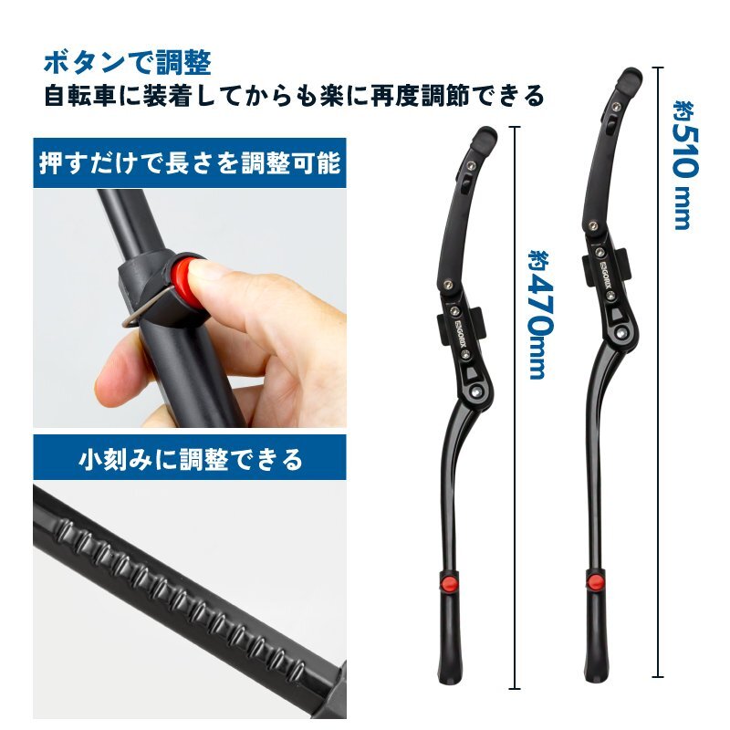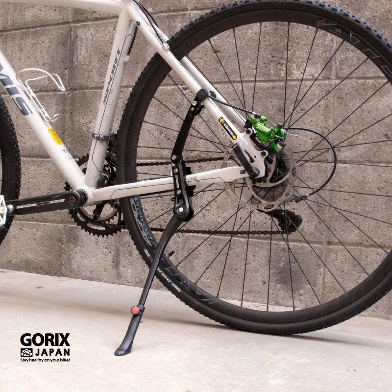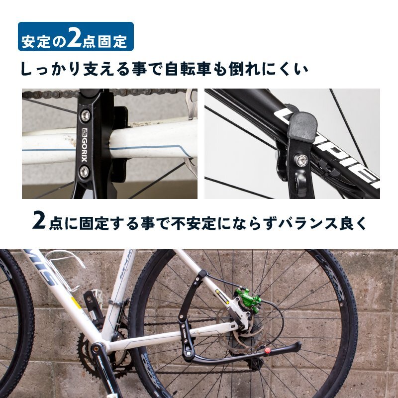 自転車の車体に取付るキックスタンド。 一度取り付ければ取り外し不用で足先だけで簡単に操作ができる安定型スタンドです。 自転車通勤や通学、買い物など頻繁に駐輪する事が多いのであれば自立するスタンドを使うのをおすすめします。 ロードバイクやクロスバイク、マウンテンバイク、ミニベロなど24-29インチ(700C)までは幅広い自転車に対応。 2点固定でしっかりと自転車を支えるので自転車はバランスよく安定して倒れにくい。装着も簡単。 ※カーボンフレームには危険なので取付できません。 ※ディスクブレーキの位置によっては装着できませんのでお持ちの自転車の位置をご確認下さい。 [2点固定] チェーンステーとシートステーの2点に固定して使用します。2点に固定する事で片足スタンドでも不安定にならずバランス良く自立します。 しっかり支える事で自転車も倒れにくい。 [幅広い自転車に対応] スタンドの脚の長さを調整する事で24-29インチまで対応します。 700cのロードバイクやクロスバイク、マウンテンバイク、ミニベロなど幅広い自転車をカバーします。 [アルミ素材] アルミ合金素材は軽量で強度が高く耐久性に優れています。 また防錆でサビに強く屋外で使用するのに向いています。 [ボタン調整] ボタン一つでスタンドの長さを調整可能で自転車に装着してからも楽に再度調節できる。 [滑り止め] 脚の裏には凸凹の滑り止め加工を施し地面と接しても滑りにくい。 底部分は強化プラスチックを採用し硬く頑丈に仕上がっています。 商品内容自転車用キックスタンド 材質アルミ合金 サイズ全長47-51cm(調節可能範囲約4cm) シートステー&チェーンステー適用角度40゜~65゜ シートステー直径16~19mm チェーンステー直径12~19mm 適用サイズ24-29"インチ(700c) 重量372g 《ご注意》 ※カーボンフレームには危険なので取付できません。 ※ディスクブレーキの位置によっては装着できませんのでお持ちの自転車の位置をご確認下さい。 | |