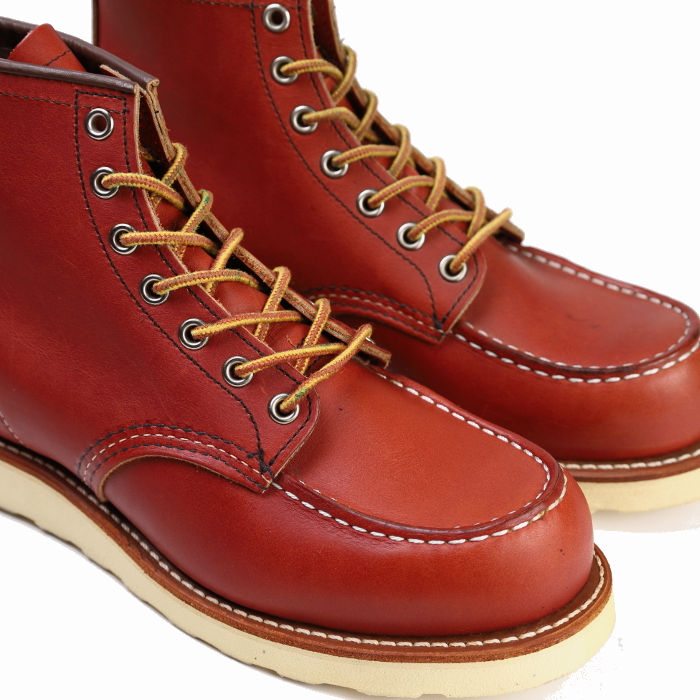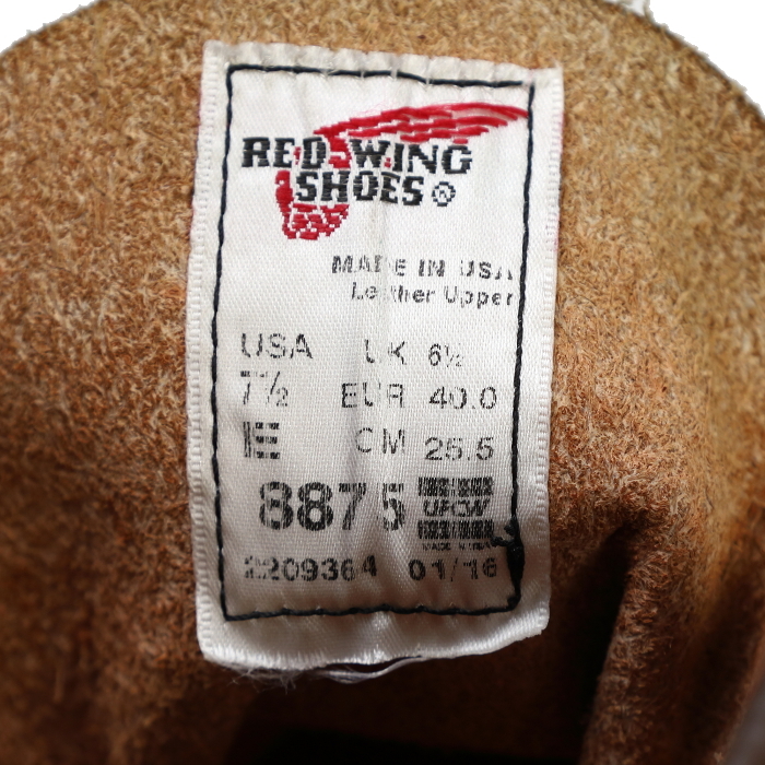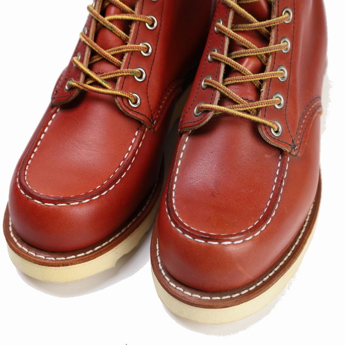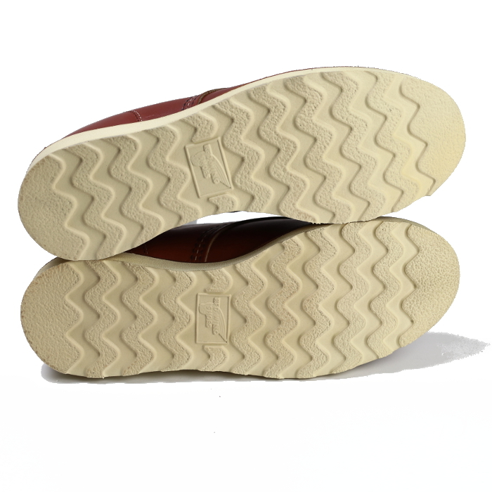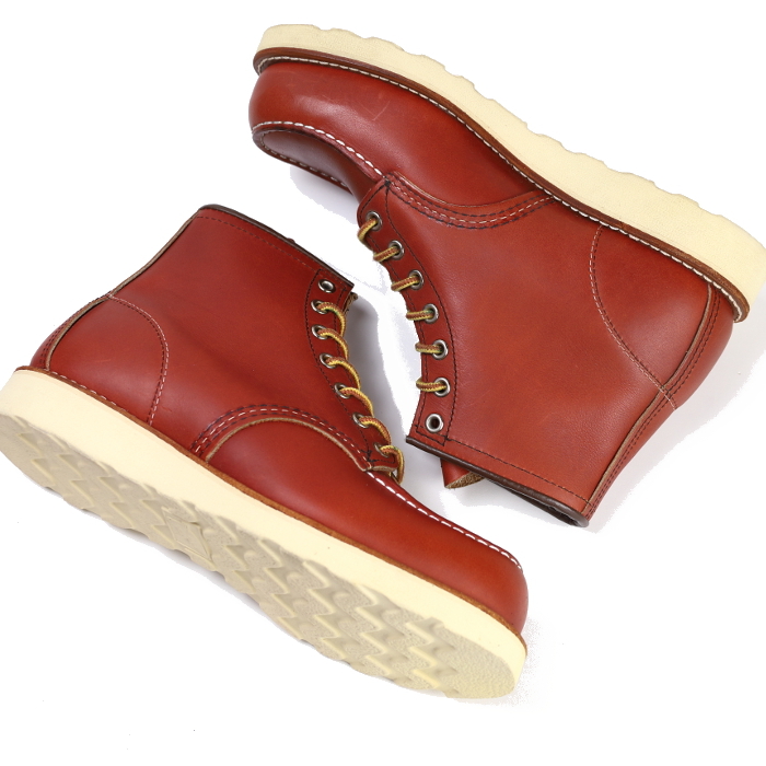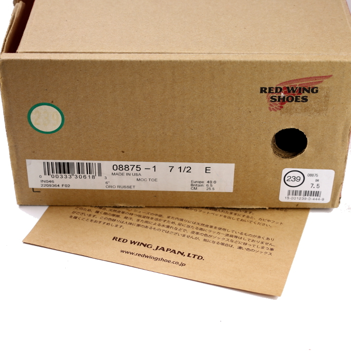 ■REDWING 6inchクラシックモック レッド・ウィング社は1952年、白く底が平らでクッション 性に富むトラクショントレッド・ソールを、ワーク・ハン ティングを用途とする男性用のブーツに初めて導入し発売 しました。8インチ丈のブーツ#877です。 数年で様々なバリエーションが広がりました。6インチ丈の #875もそのひとつです。 モカシンタイプのつま先などが持つ履きやすさ。 どのような場所でも歩きやすく長時間履いても疲れにくい トラクショントレッド・ソール。 さらに、良質なレザーや堅牢なつくりがもたらす機能性と 耐久性で、#875は#877と共にワーカー達に絶大な支持を得て アメリカを代表するワークブーツとなり、その後約65年経っ た現在でも、レッド・ウィングを代表するブーツとして愛さ れ続けています。 この#875にかつて使われていた、オロラセット・レザーは 元々オレンジがかったブラウンの色をしていましたが、1990 年代に入ると、次第に赤みを増していきました。 その後、アメリカ市場で一旦元の色に戻そうという事になった 時に、日本市場で人気の高かった赤みの強い色合いを、オロラ セット・ポーテージという別のレザーをつくり、別の品番の 商品に採用して日本市場で維持する事になり、1996年に#875 のバリエーションである#8875が生まれました。 以来、#8875は日本市場でレッド・ウィングを代表するブーツ として、常にトップセラーのひとつであり続けています。 ☆新品・箱付 レッド・ウィング・ジャパン(株) 取扱の国内正規品です。 "MADE IN USA" 定価¥51,150-(税込)。 ※生産時に使用される革(天然皮革)や革の部分により、革の 質感の異なる場合や革の性質上シワやキズ、左右差がある 場合がございます。 詳細 【ブランド】 RED WING レッドウィング 【品名】 8875 アイリッシュセッター 6inch クラシック 【カラー】 オロ ラセット (赤茶) 【素材】 アッパー:天然皮革 ソール:合成底 【サイズ】 表記サイズ US 7.5 E/ JP 25.5 CM アウトソール実寸:全長 約 29.8CM 幅 約 10.4CM ※サイズはブランドやデザインによりまして、大きめや 小さめがございます。こちらのお品は大きめかと思われます。 アウトソール実寸などご参考に、十分ご検討の上、ご入札 をお願い申し上げます。 【製造国】 USA 【状態】 新品・箱付。 |