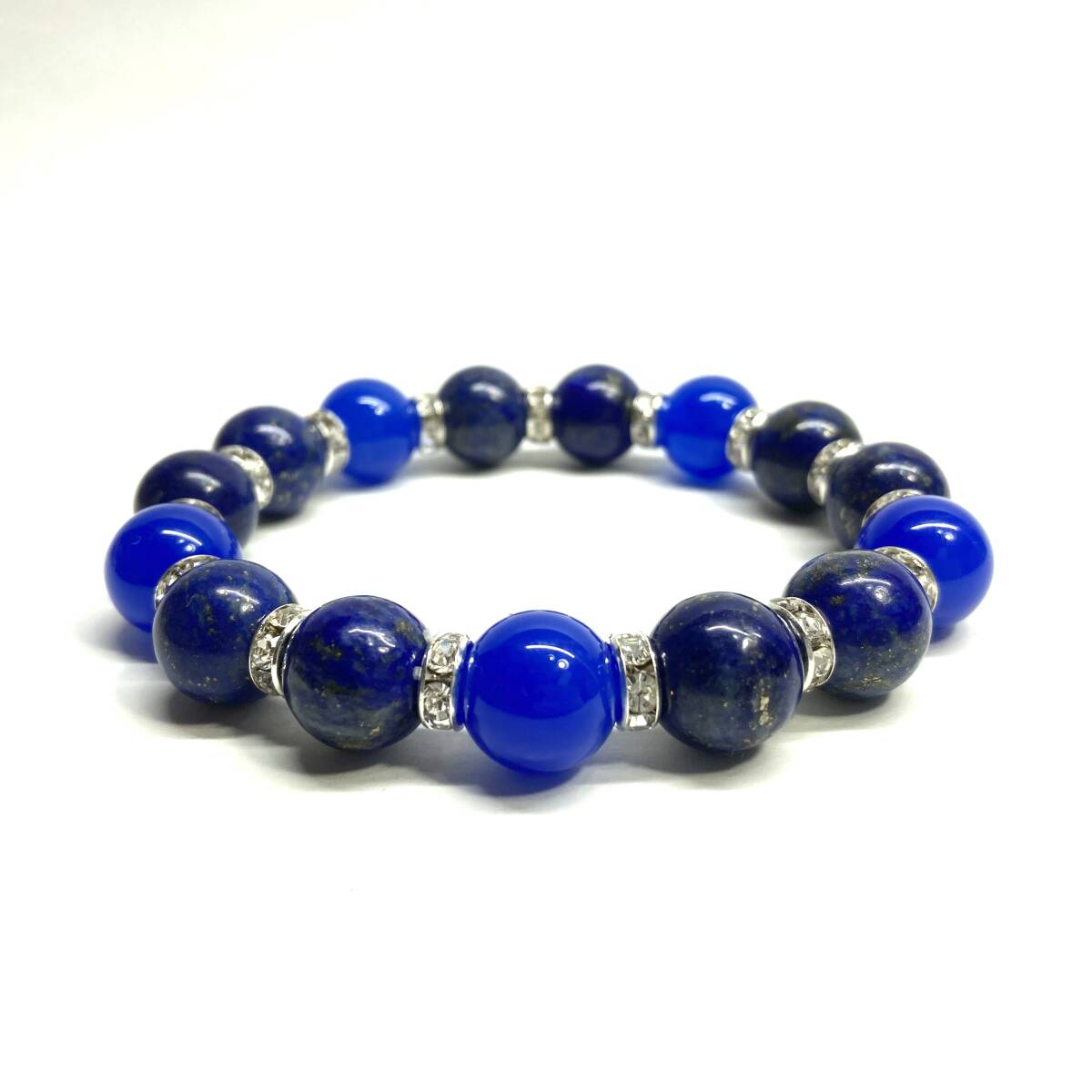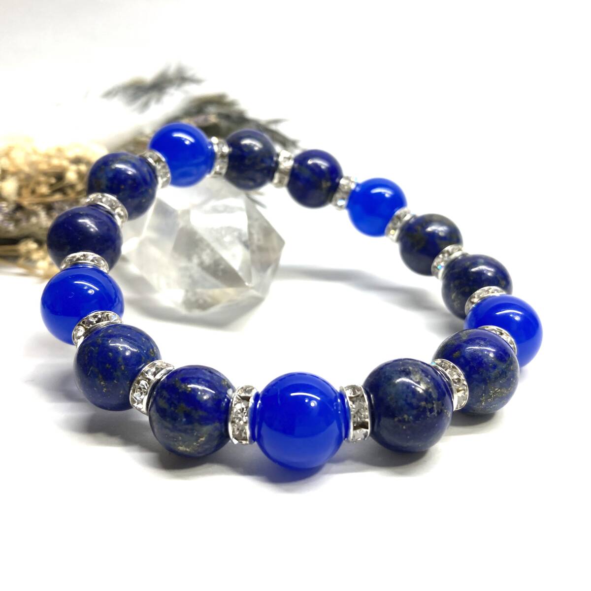 こちらは、ラピスラズリと青瑪瑙 を組み合わせたパワーストーンブレスレットです。間にはロンデルを挟み高級感あるデザインに仕上げております。程よくインパクトがある12mm玉を使用して内周約18cmです。(サイズ変更の場合は取引ナビにてご連絡をお願いします。) 数に限りがございますので気になる方はお早めにどうぞ。
