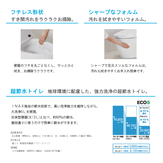 洗浄水量大5リットル、小3.8リットル。旧来型便器(大13リットル)と比べ約69%の節水を実現。