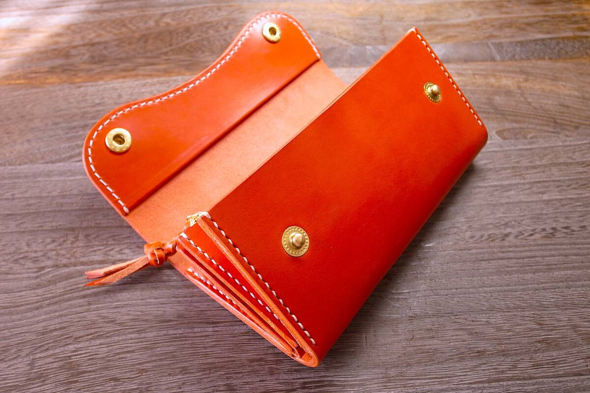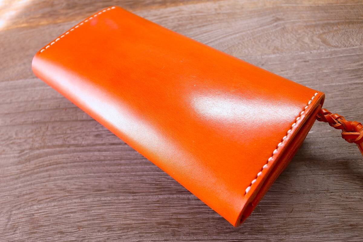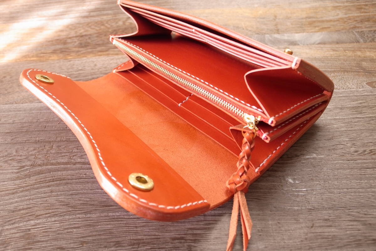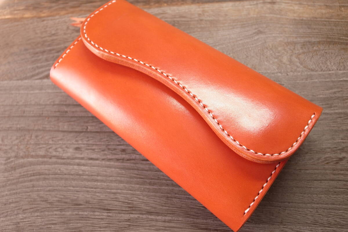 オールハンドメイドで制作した長財布になります。 縫い糸はステッチが映える白糸を使用しております メインの革は約4.3mmの厚革を使用しております 重厚感たっぷりのウォレットになります。 厚革好きの方にはお勧めです 革が固く厚いので馴染むまでは、蓋が開いてしまうかもしれません 小銭入れ部分は信頼のあるYKKのファスナーを使用し 開閉しやすいように革ひもを四つ編みにしてあります。 蓋に使用している金具は使えば味が出てくる真鍮製のものを 取り付けてありますので、革同様にエイジングを楽しめると思います カードは12枚収納 ウォレットサイズ 約20.3cm×約11.5cm 色 赤 お届けするものは、写真の商品になります。 オールハンドメイドですので、手間と時間はかかりますので 大量生産をすることが出来ませんが革の裁断、縫い付けなど、 全ての工程を私自身が手作業にて行っております。 革の表情が一つ一つ違うので、世界に一つだけの1点物になります。 ★★★★★★★★★★★★★★★★★★★★★★★★★★★★★★ ホームページがありますので制作のご依頼・商品のお問い合わせなどは この文字をクリックして下さい。 ★★★★★★★★★★★★★★★★★★★★★★★★★★★★★★ オプションでドロップハンドルの希望があれば、取り付け可能です ドロップハンドルの写真はHPのロングウォレットのページで 確認が出来ます。 ※革の厚みなどで取り付け出来ない場合や在庫が無い場合もございますので ご希望がありましたら事前にお問い合わせ頂ければと思います。 ★★★★★★★★★★★★★★★★★★★★★★★★★★★★★★ | ||||