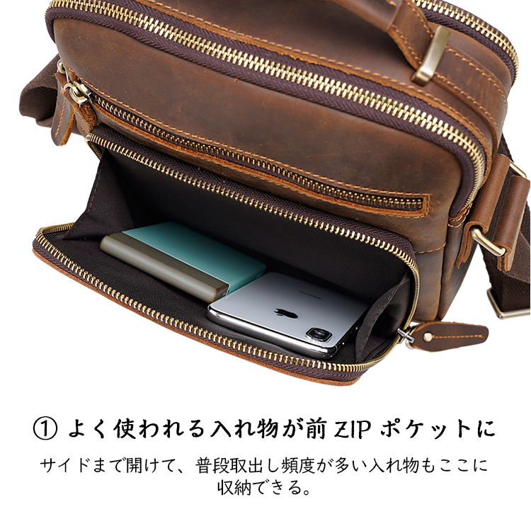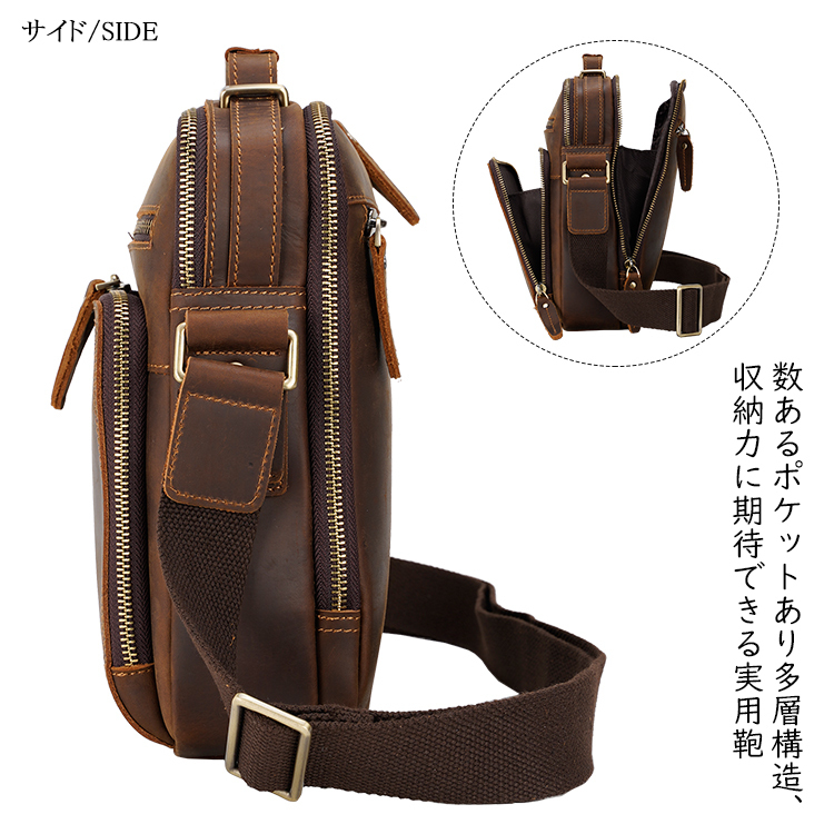 TIDING ラウンドZIP 厚手牛革 本革 メッセンジャーバッグ 斜め掛けショルダーバッグ 2WAY ダークブラウン 潮牛